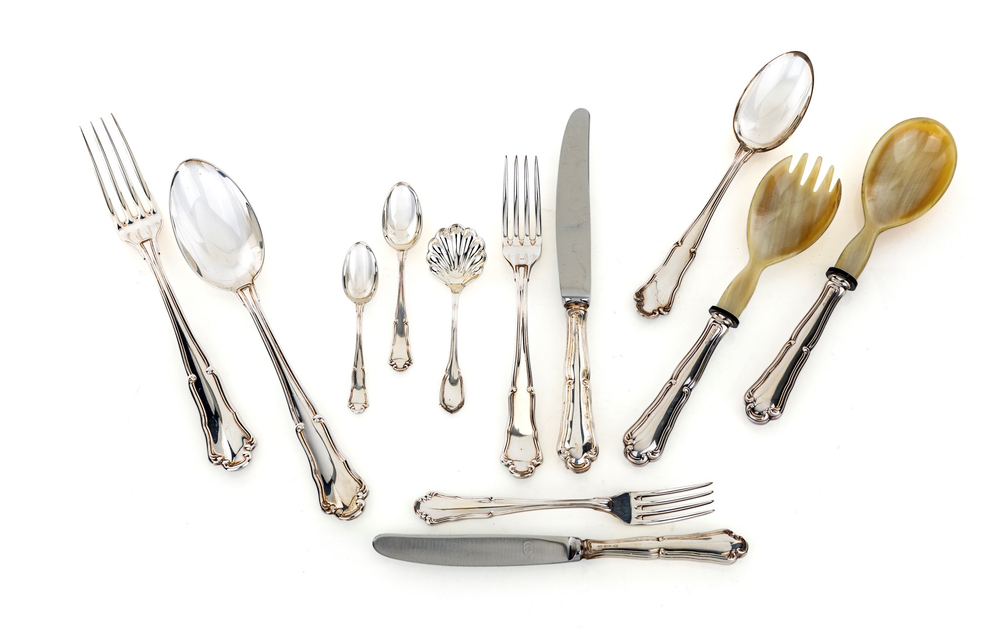 Servizio di posate in argento per quattordici persone composto da 14 cucchiai da pasto, 28 forchette e 14 coltelli; 14 forchette ed altrettanti coltelli da frutta, 14 cucchiaini da caffè, 14 da dolce, un cucchiaio per lo zucchero con paletta a forma di conchiglia, cucchiaio e forchetta per servire e due posate da insalata in argento e corno peso complessivo gr. 4894 (esclusi i coltelli)