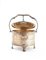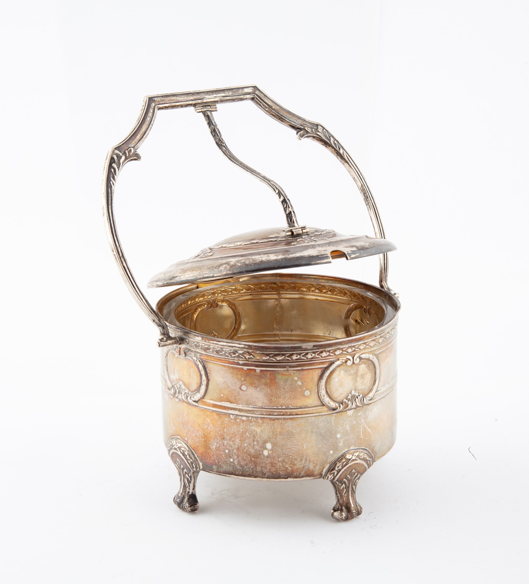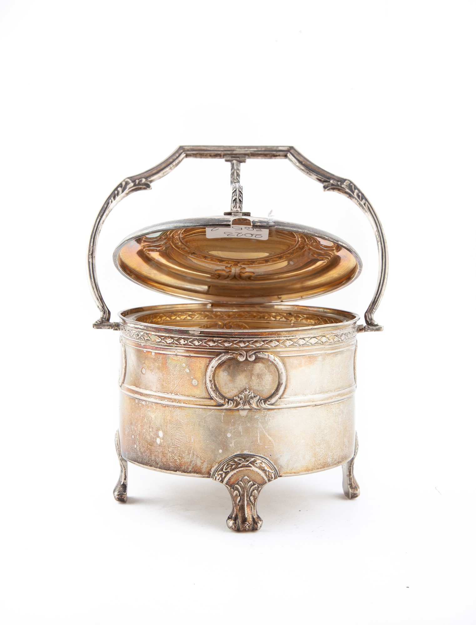 Formaggera in argento (?) con vaschetta in vetro. Difetti (coperchio dissaldato) corpo cilindrico con nervatura mediana e cartigli nella fascia superiore, coperchio incernierato apribile tramite inclinazione del manico, piedi a mensola cm 19x10 - gr. 116