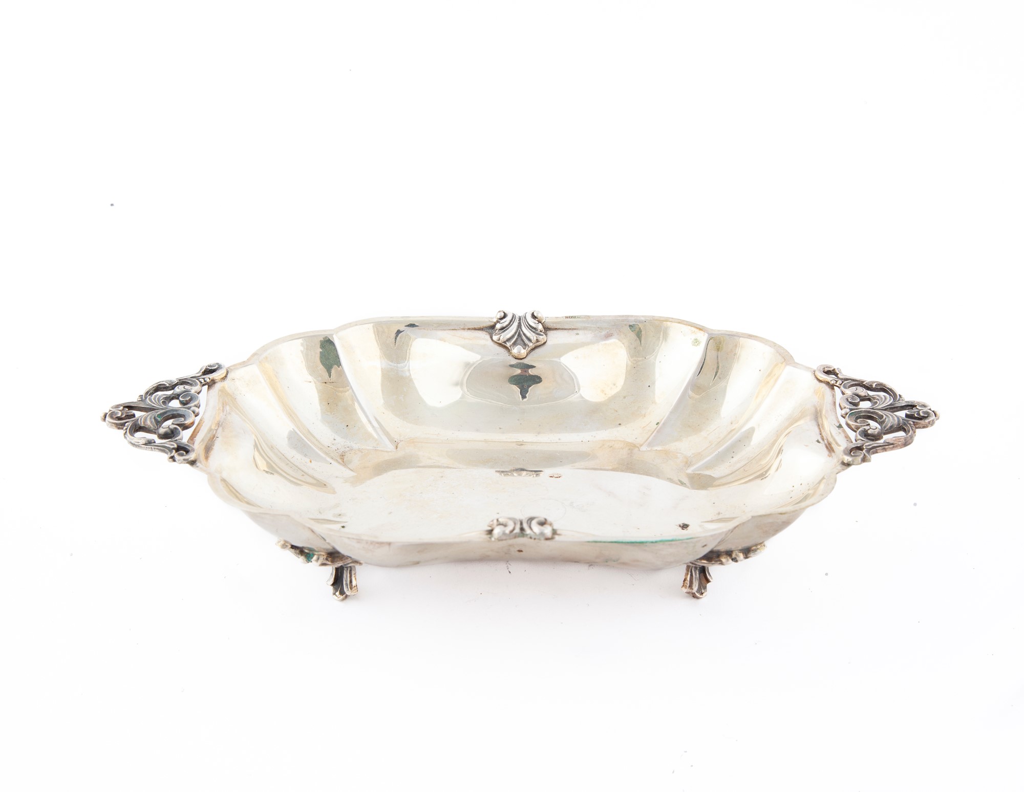 Vaschetta biansata in argento di forma sagomata sbalzata decorata da rilievi vegetali, sorretta da piedi a cartiglio cm 4x22x12,5 - gr. 154