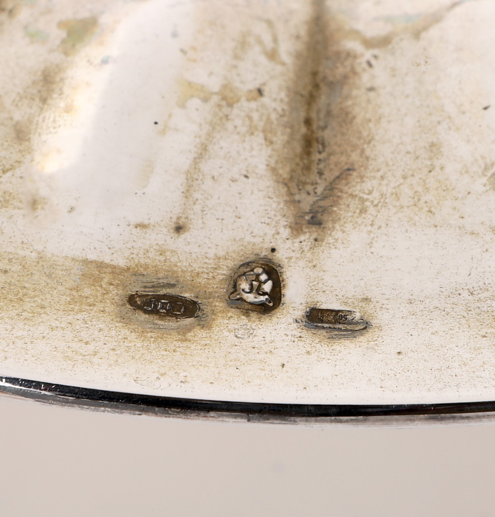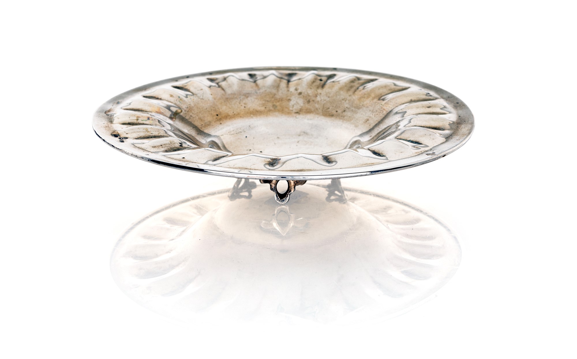 Alzatina in argento con cavetto convesso ed ampia tesa percorsa da baccelli; piedi stilizzati, difetti cm 4,5x22 - gr. 182