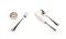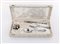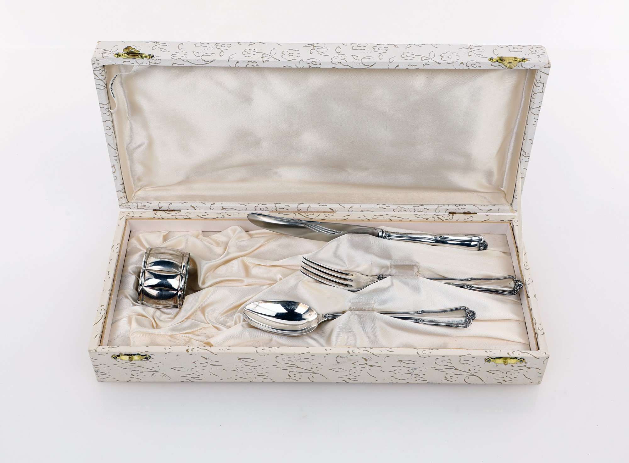 Posate da bambino in argento con portatovagliolo entro astuccio in cartone rivestito in carta avorio con fiori delineati in oro cm 15 - gr. 66 escluso il coltello - misura dell'astuccio cm 5x29x13
