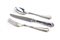 Tre posate da pasto da bambino in argento composto da cucchiaio, forchetta e coltello entro astuccio della Gioielleria e Argenteria Ulderico Amici di Roma cm 15 e cm 18 - peso gr. 60 (escluso il coltello) - astuccio cm 3,5x22,5x13,5