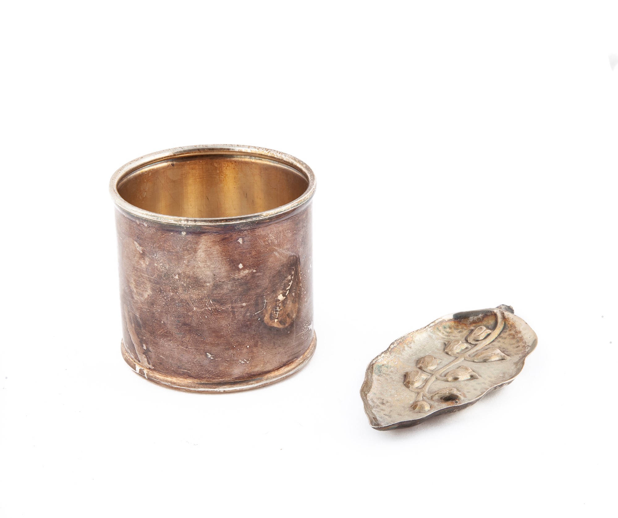 Bicchiere in argento 800, Galbiati e piattino a forma di foglia il primo di forma cilindrica con orli sottolineati da cordolo liscio; la foglia di forma allungata e martellata decorata da un tralcio di mughetto a sbalzo cm 7x7,5 e cm 10,5x6 - peso complessivo gr. 200