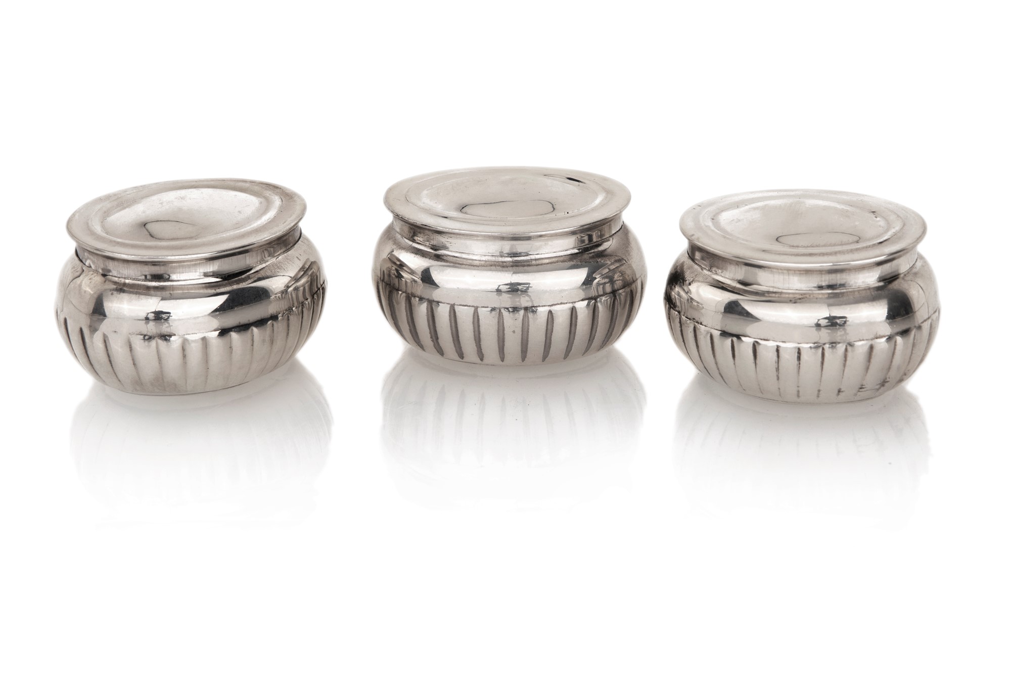 Tre portapillole in argento 925 di forma ovale con corpo decorato nella parte inferiore da fasce delineate cm 3x4,3x3,5 - peso complessivo gr. 70