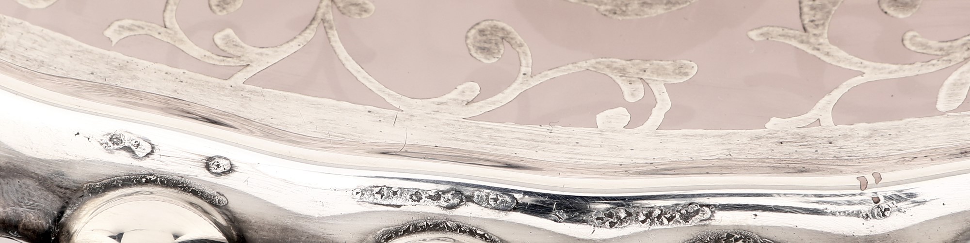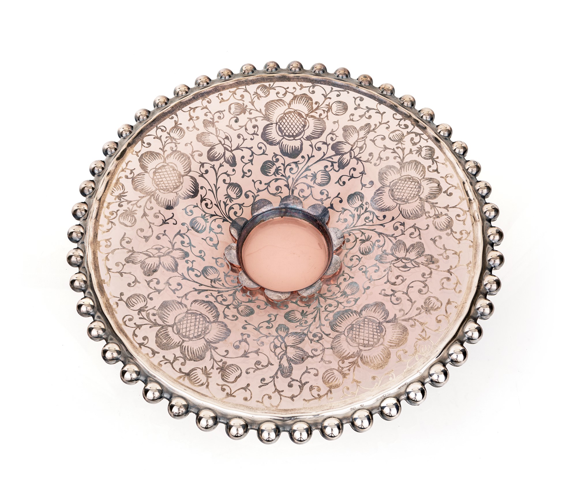 Centrotavola in vetro ametista e argento, produzione vetraria muranese del Novecento con orlo perlinato e fitta decorazione a tralci fioriti in argento cm 8x41