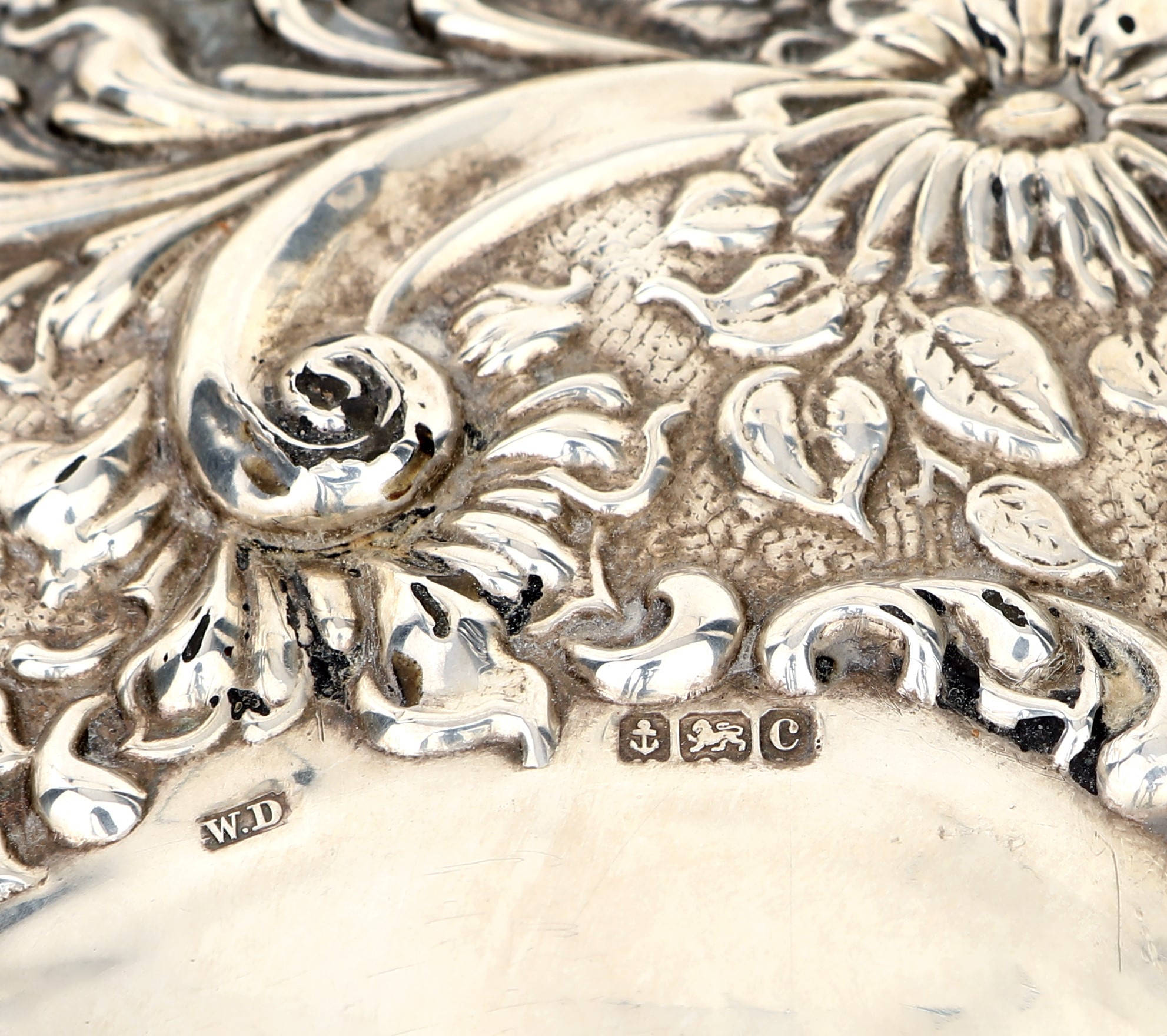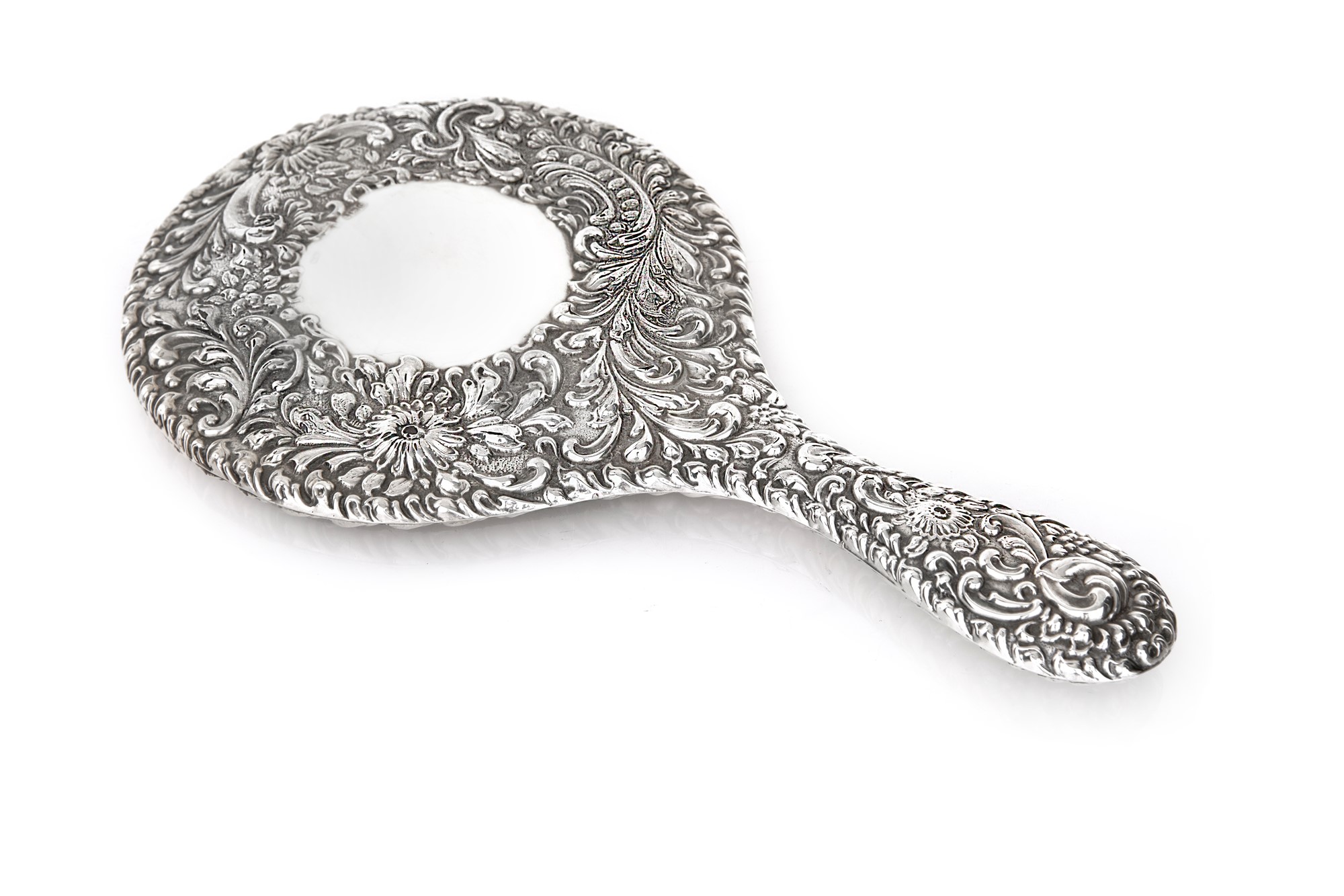 Specchio da toletta in argento, Birmingham 1904, argentiere William Devenport con fitta decorazione in rilievo a volute vegetali e fiori cm 28x16