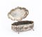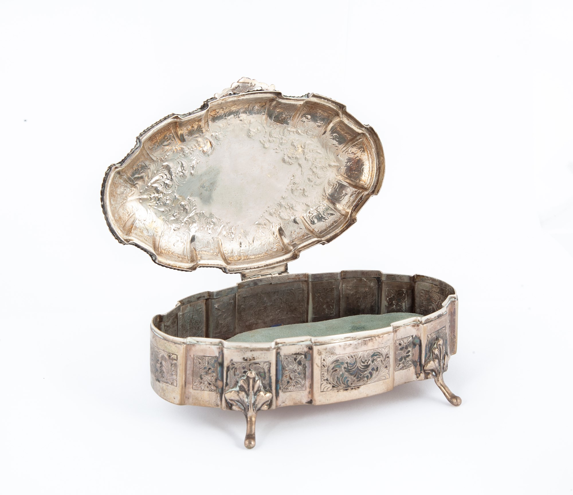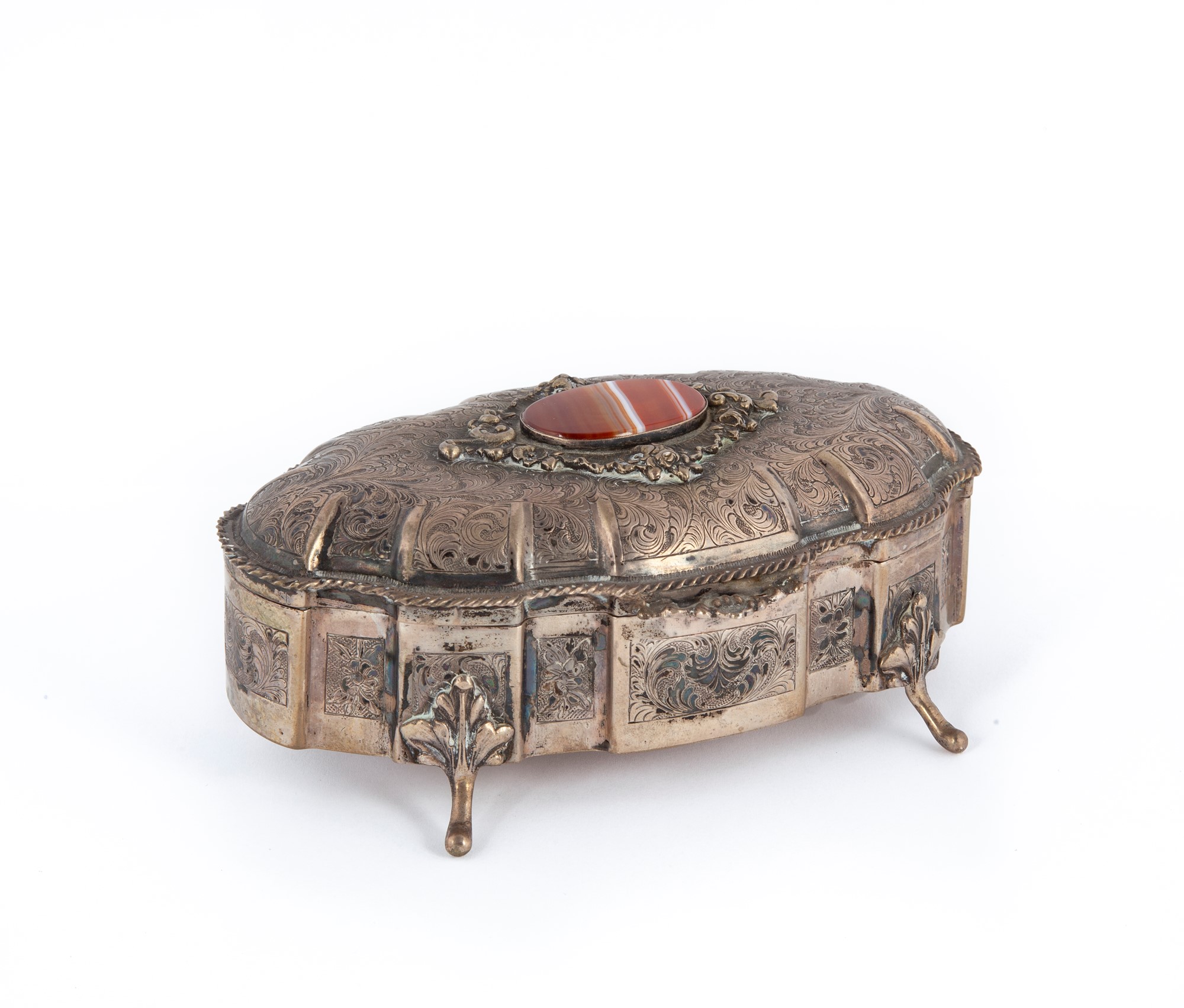 Cofanetto porta gioie in argento con agata di forma ovale sagomata con fitta decorazione incisa a motivi vegetali; coperchio incernierato centrato da una corniola, piedi sfuggenti con attacco a palmetta cm 8x18x10,5 - gr. 464