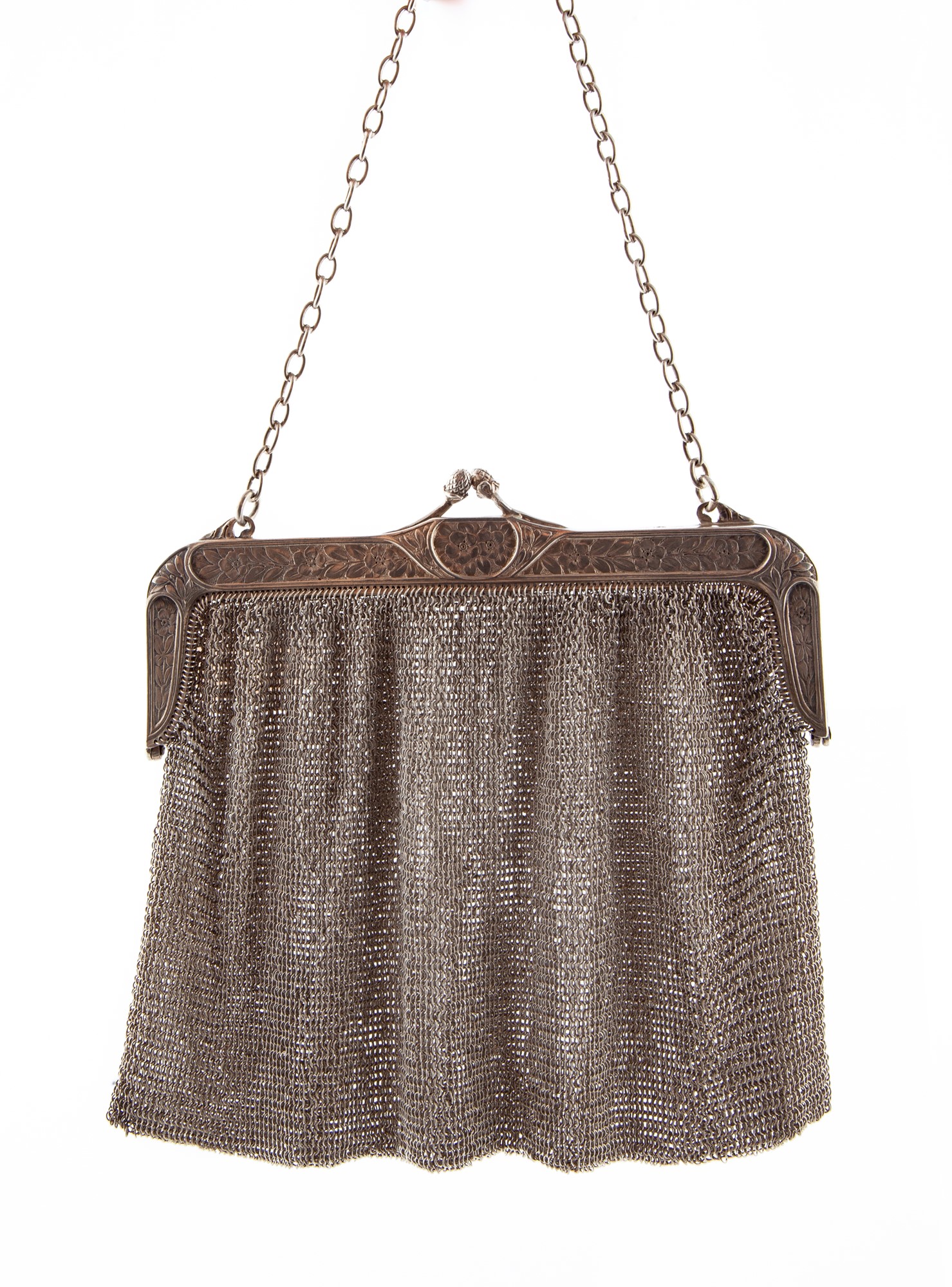 Borsa chatelaine d'argento d'epoca Liberty, Germania, argentiere Geschutzt con corpo costituito da una fitta maglia d'argento intrecciato, trattenuta nella parte superiore da una struttura rigida decorata da motivi vegetali e fiori cesellati; apertura a scatto mediante due pignette incrociate; completa di catenella cm 13,5x14 - con la catenella cm 25,5gr. 225