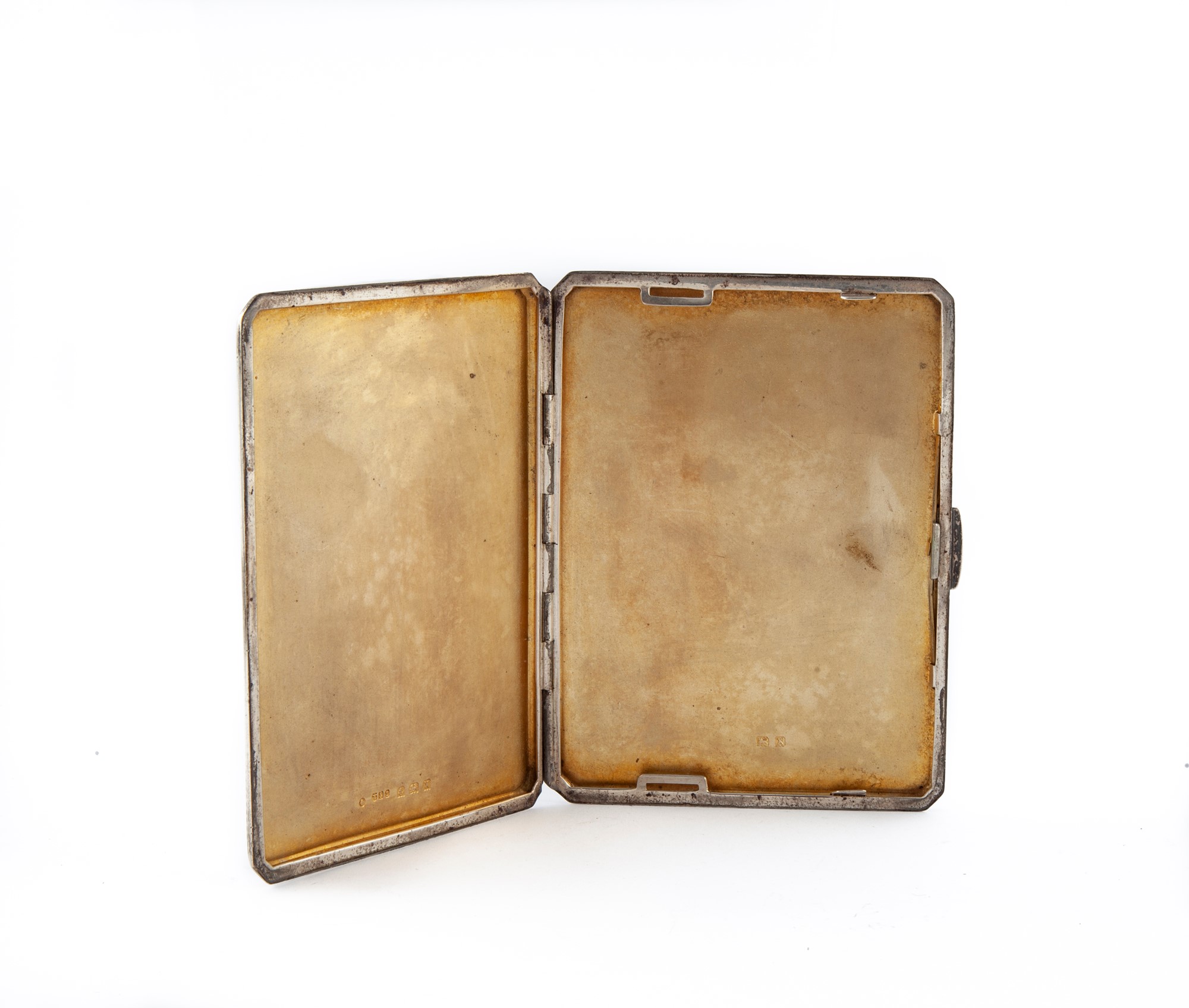Portasigarette in argento Birmingham 1947, argentieri E. J. Trevitt & sons superficie interamente zigrinata ad eccezione di un piccolo tassello angolare per incisione; interno dorato ed apertura a scatto cm 1x11,5x8,5 - gr. 172
