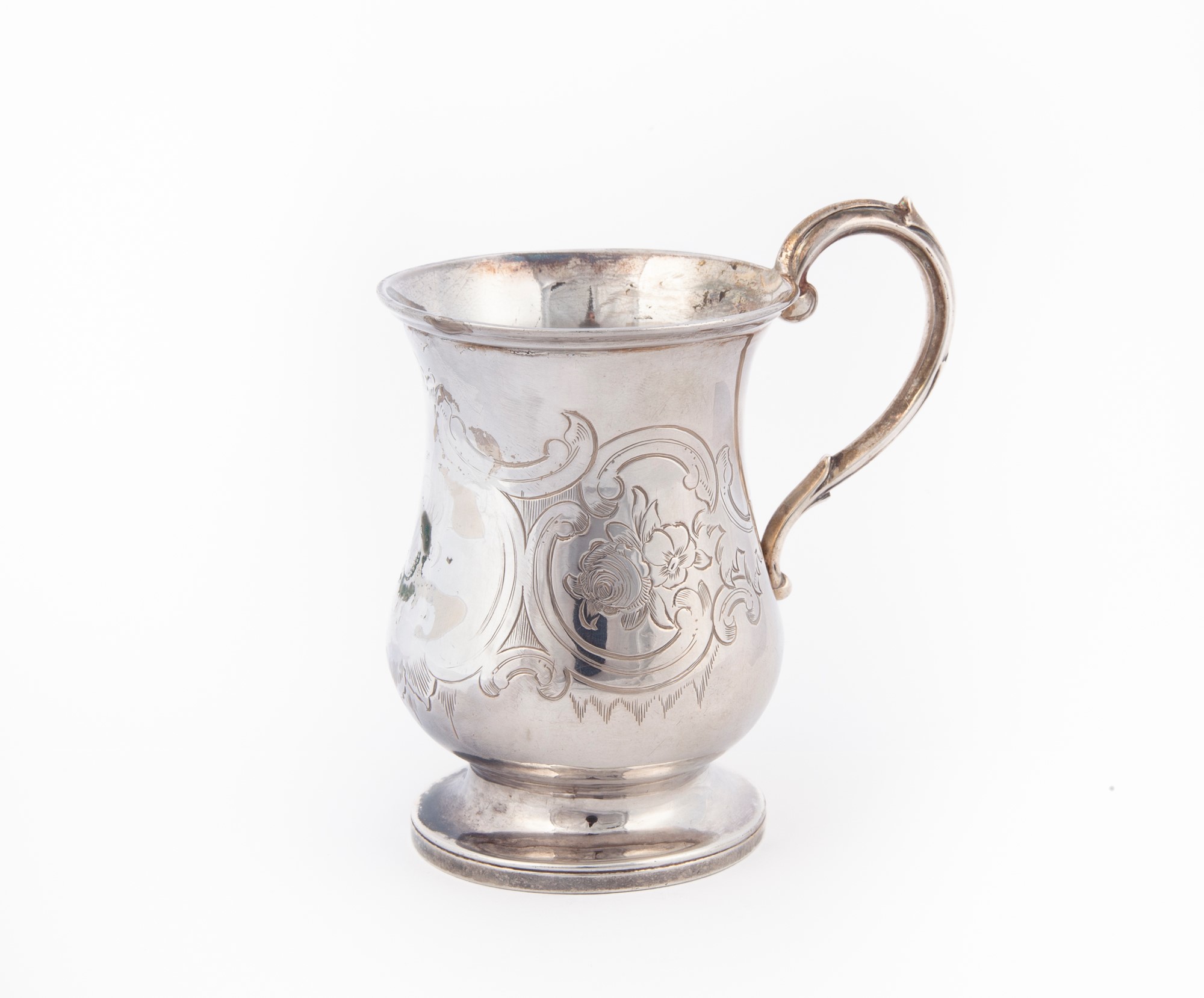Piccolo boccale in argento, Londra, 1851, argentiere George John Richards (attivo dal 1848) con corpo a vaso su piede circolare, decorato da rose incise entro cartigli; manico sagomato altezza cm 9,5 - gr. 82