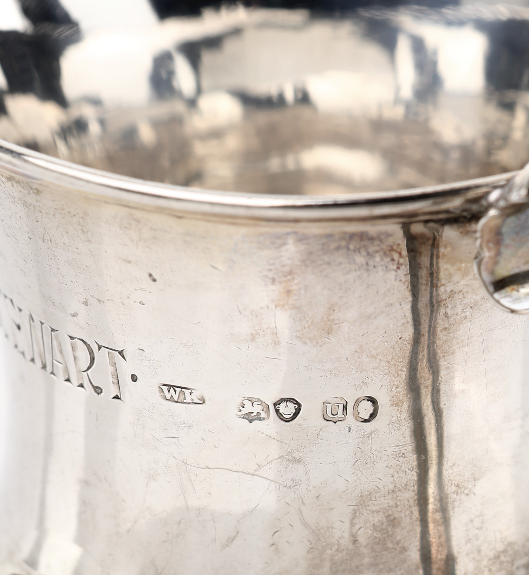 Boccale in argento, Londra, 1835, argentiere William Knight II o William King con corpo a vaso su piede circolare, caratterizzato da iscrizione dedicatoria al luogotenente dell'esercito britannico Stewart Strothers ("Collingwood George Franklin Strothers Stewart"); manico sagomato percorso da sottili nervature ed impreziosito alle estremità da rilievi vegetali altezza cm 10,5 - gr. 142