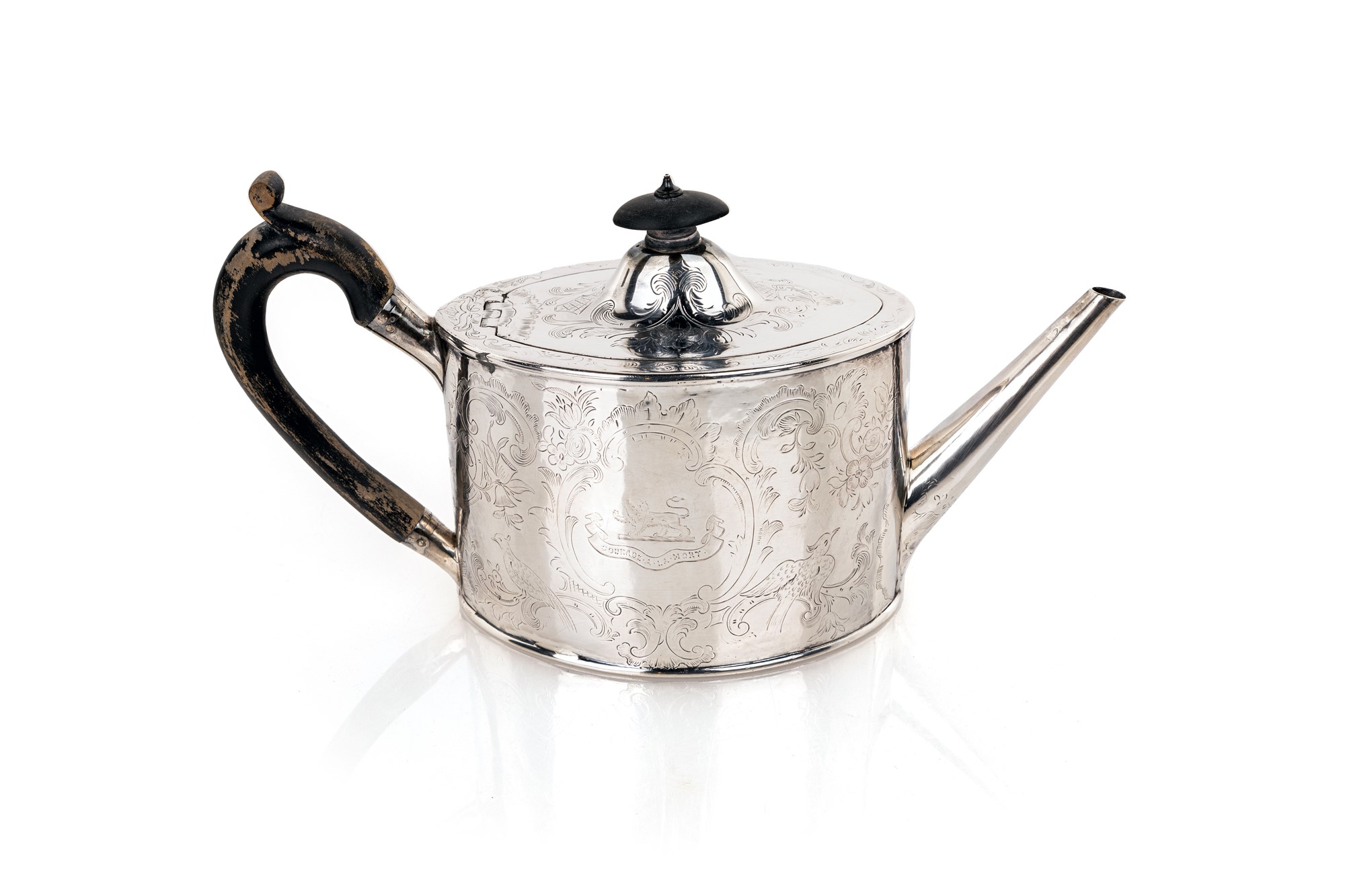 Teiera in argento 925/1000, Londra 1791, argentiere Thomas Hall corpo ovale, versatoio cilindrico, manico in legno cm 14,5x28x10 - peso lordo gr. 415