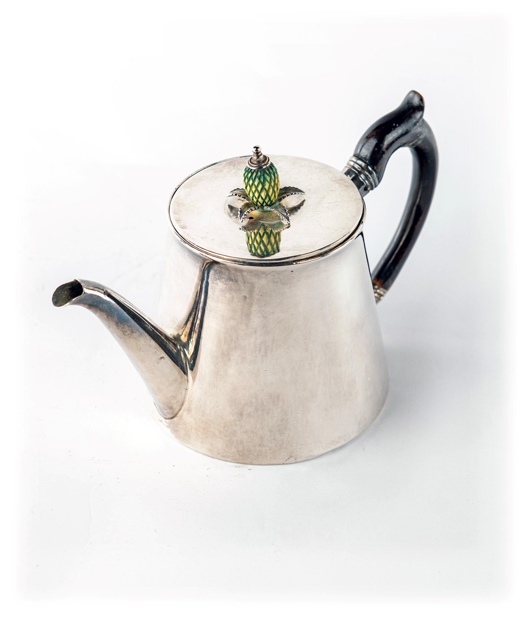 Teiera in argento d'epoca Giorgio III , Londra 1770, argentieri John Parker & Edward Wakelin con corpo a tronco di cono con versatoio cilindrico, manico sagomato in legno e coperchio a scomparsa sormontato da ananas cm 13x20x11,5 - gr. 368 lordi