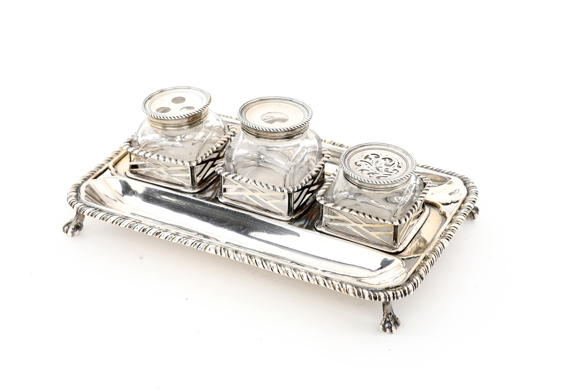 Calamaio in argento d'epoca Giorgio III, Londra 1765 vassoio rettangolare con profilo cordonato sorretto da piedi ad artiglio su sfera, con due scanalature portapenne e tre flaconi in vetro cm 18,5x11,5 - gr. 294