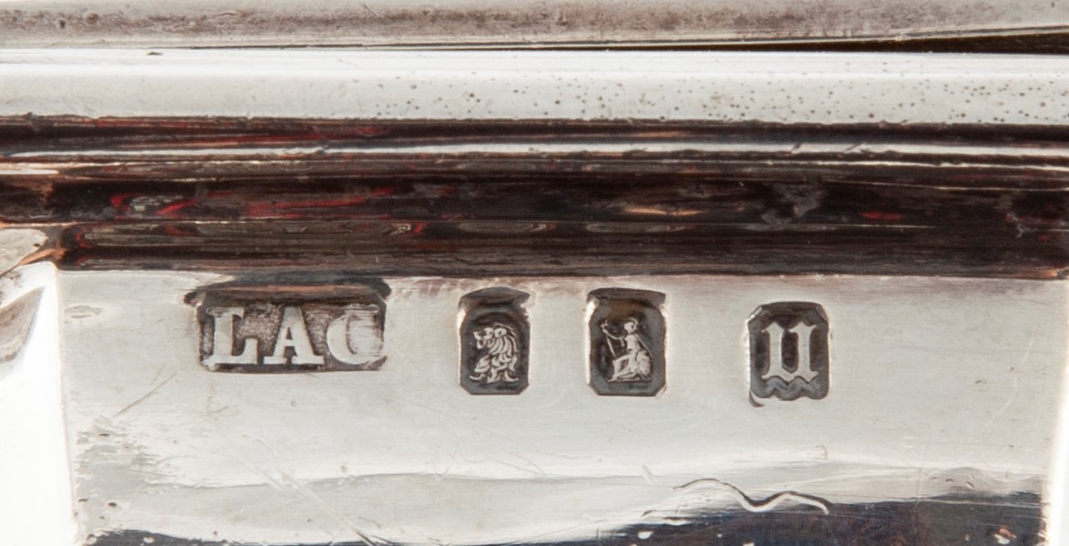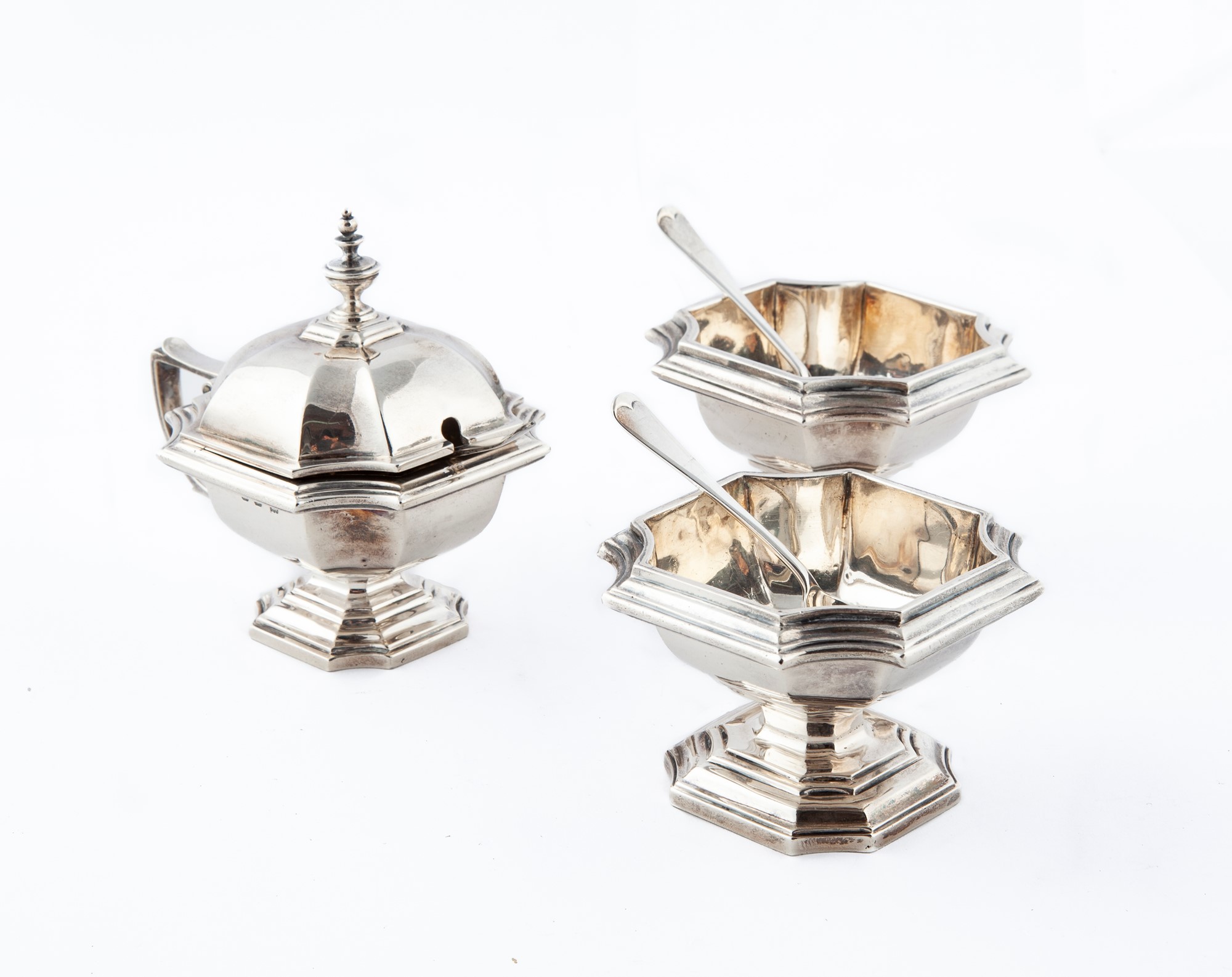 Coppia di saliere e mostardiera in argento 925/1000 con cucchiaini, Londra 1914, argentiere Crichton Brothers a forma di vaso squadrato con orlo gradinato e angoli concavi; la mostardiera, con vaschetta interna in vetro, manico arcuato e coperchio a cupola incernierato, sormontato da un pinnacolo cm 5,5x8x8 e cm 9,5x10x7,5 rispettivamente - peso complessivo gr. 674