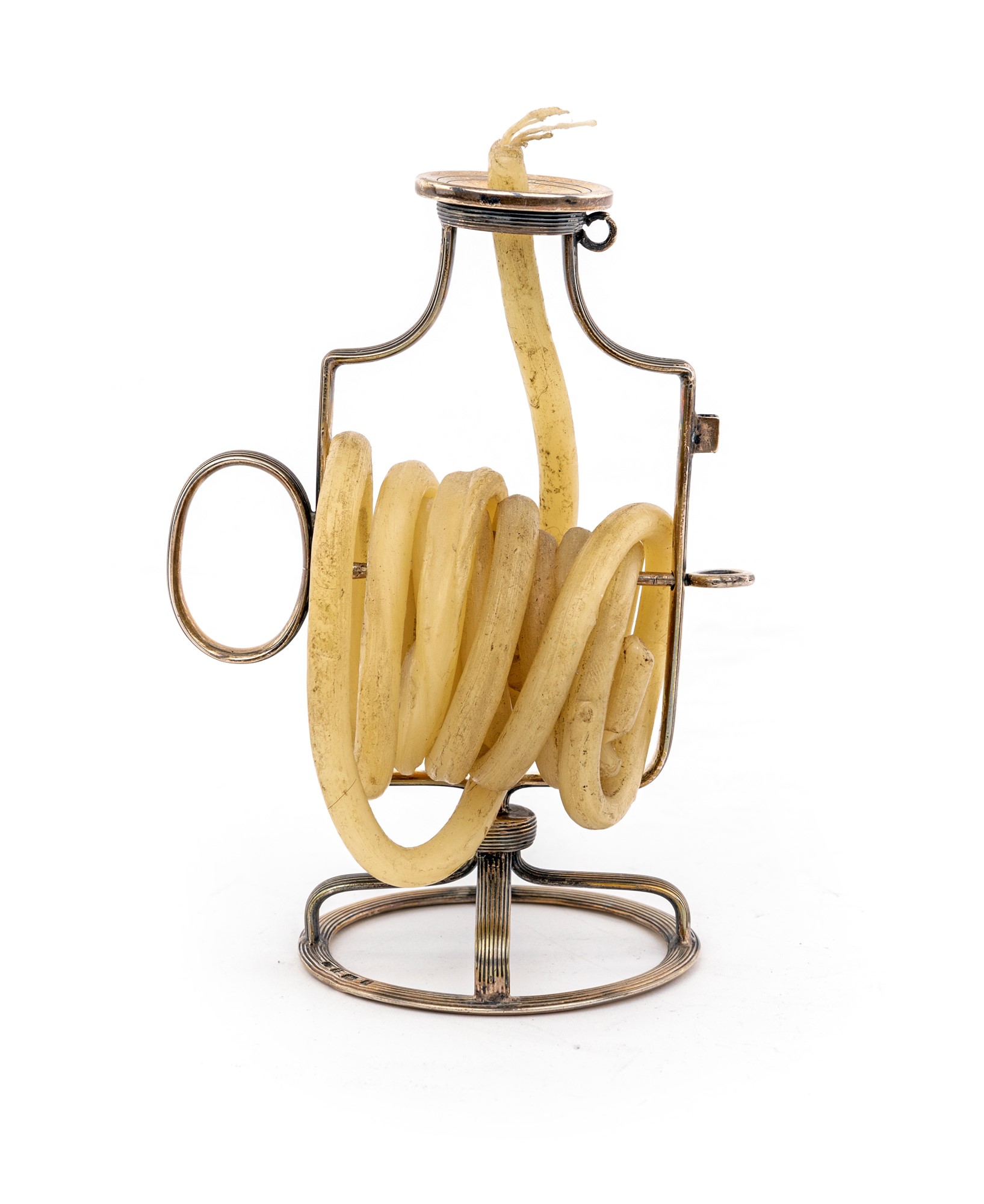 Stoppiniera in argento, Birmingham 1900 con struttura rigata; completa di lungo stoppino arrotolato rivestito in cera; mancante lo spegni moccolo cm 12,5x9,5x7 - peso complessivo lordo gr. 140