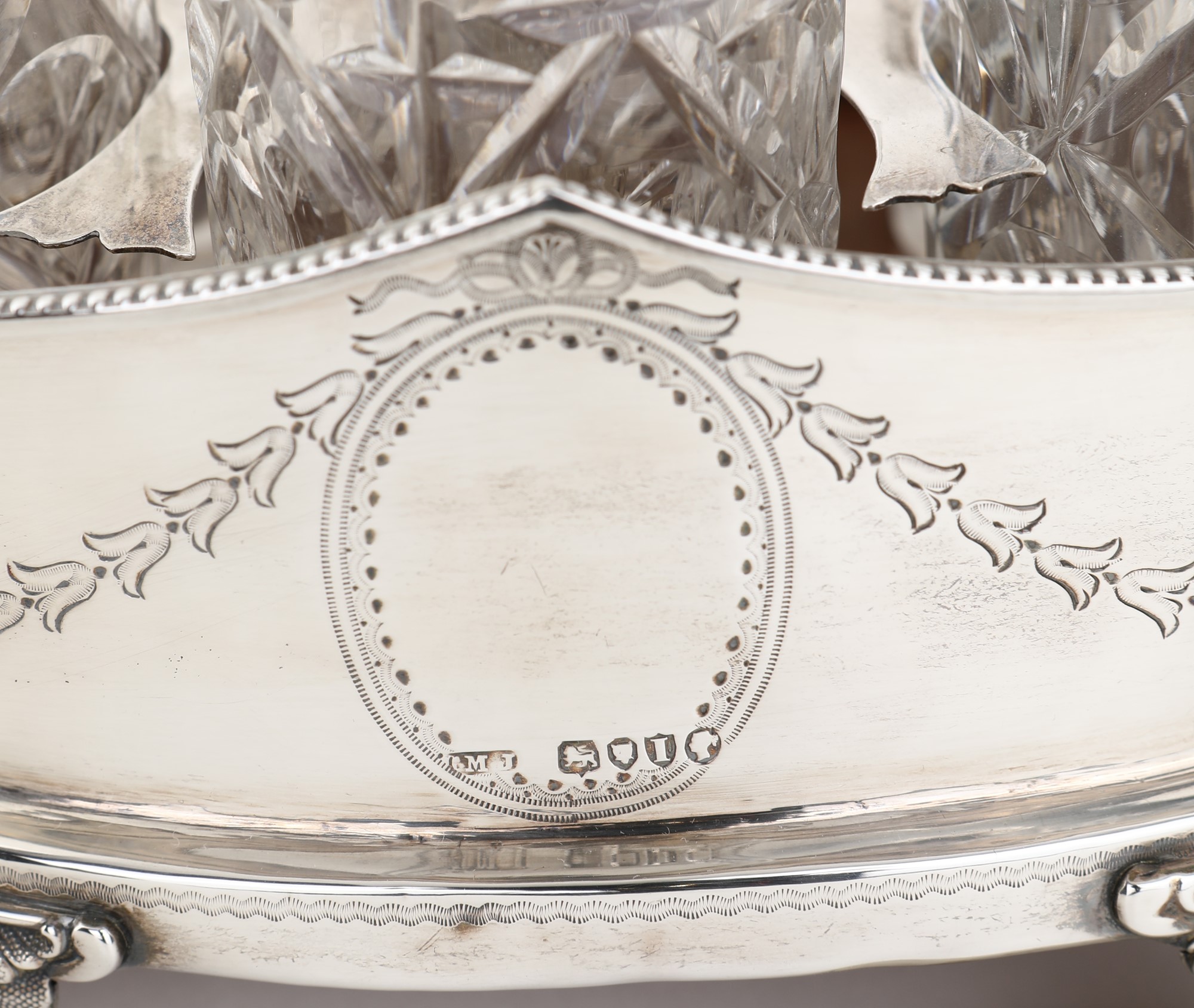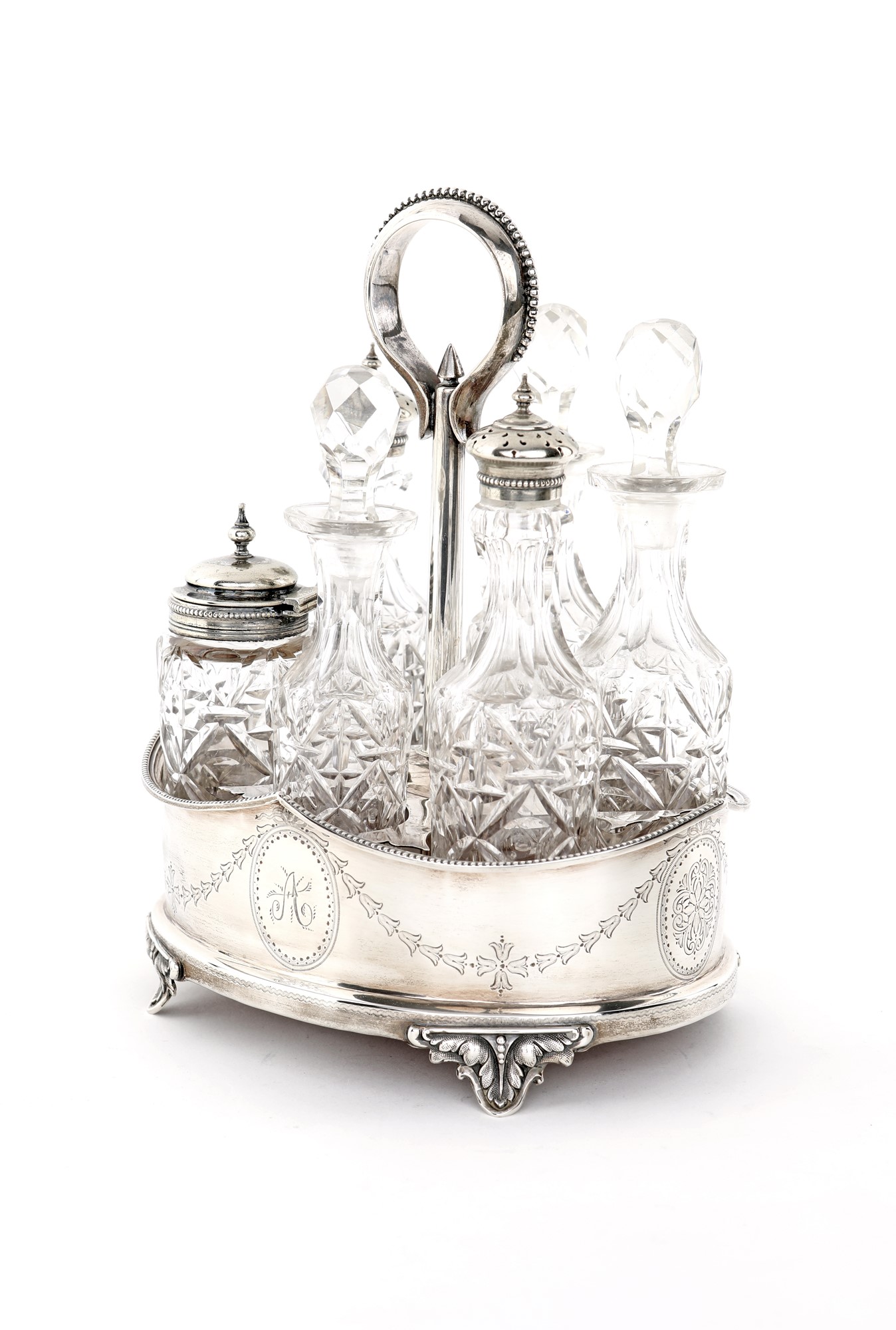 Cruet in argento, Londra 1884, argentiere G.M.J. di forma ovale con supporto in legno, completa di sei ampolle porta condimento in cristallo di cui tre con con sommità in argento; presa astile centrale con anello perlinato, monogramma A inciso entro medaglione ovale, piedi cesellati a motivi vegetali cm 25x20x15,5 - gr. 400 lordi