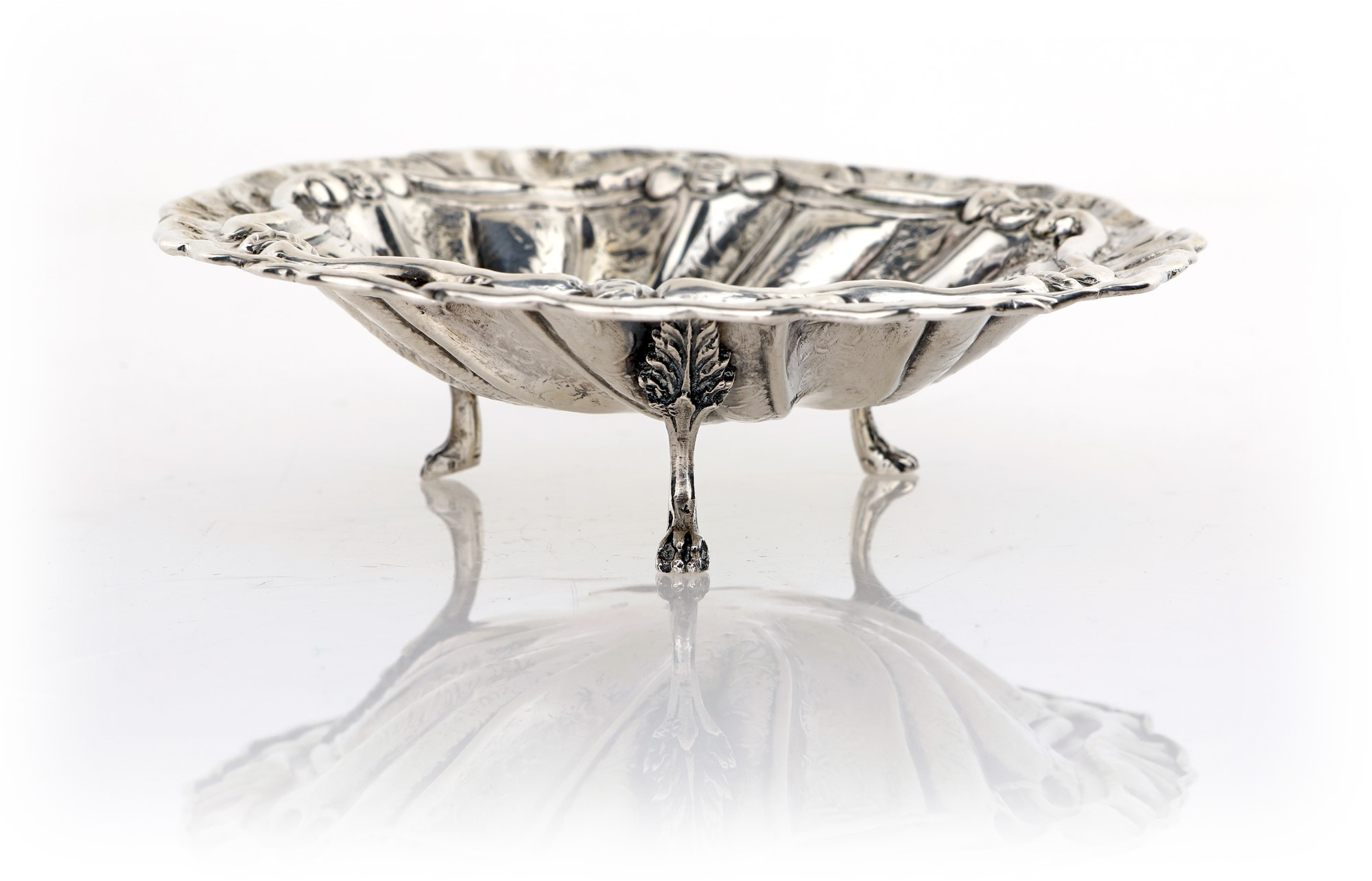 Vaschetta in argento 800/000, Milano, fine del XIX secolo di forma circolare, con decorazione sbalzata ed incisa, sorretta da tre piedi ferini con attacco a palmetta cm 4,5x15 - gr. 146