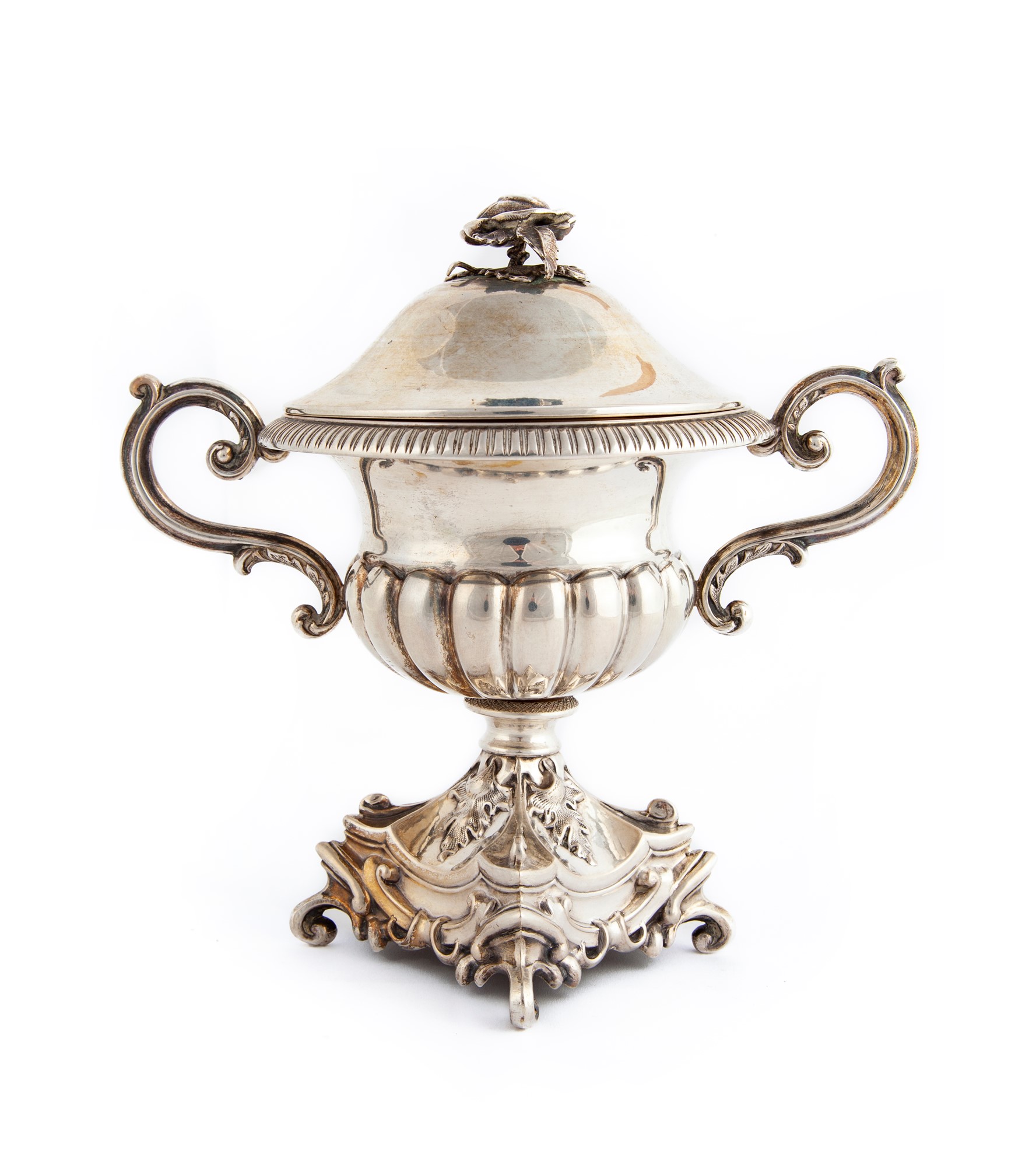 Zuccheriera in argento con coperchio a forma di coppa baccellata e biansata; coperchio a cupolino con presa scultorea in forma di fiore, base quadrangolare sbalzata cm 16,5x17x11 - gr. 306
