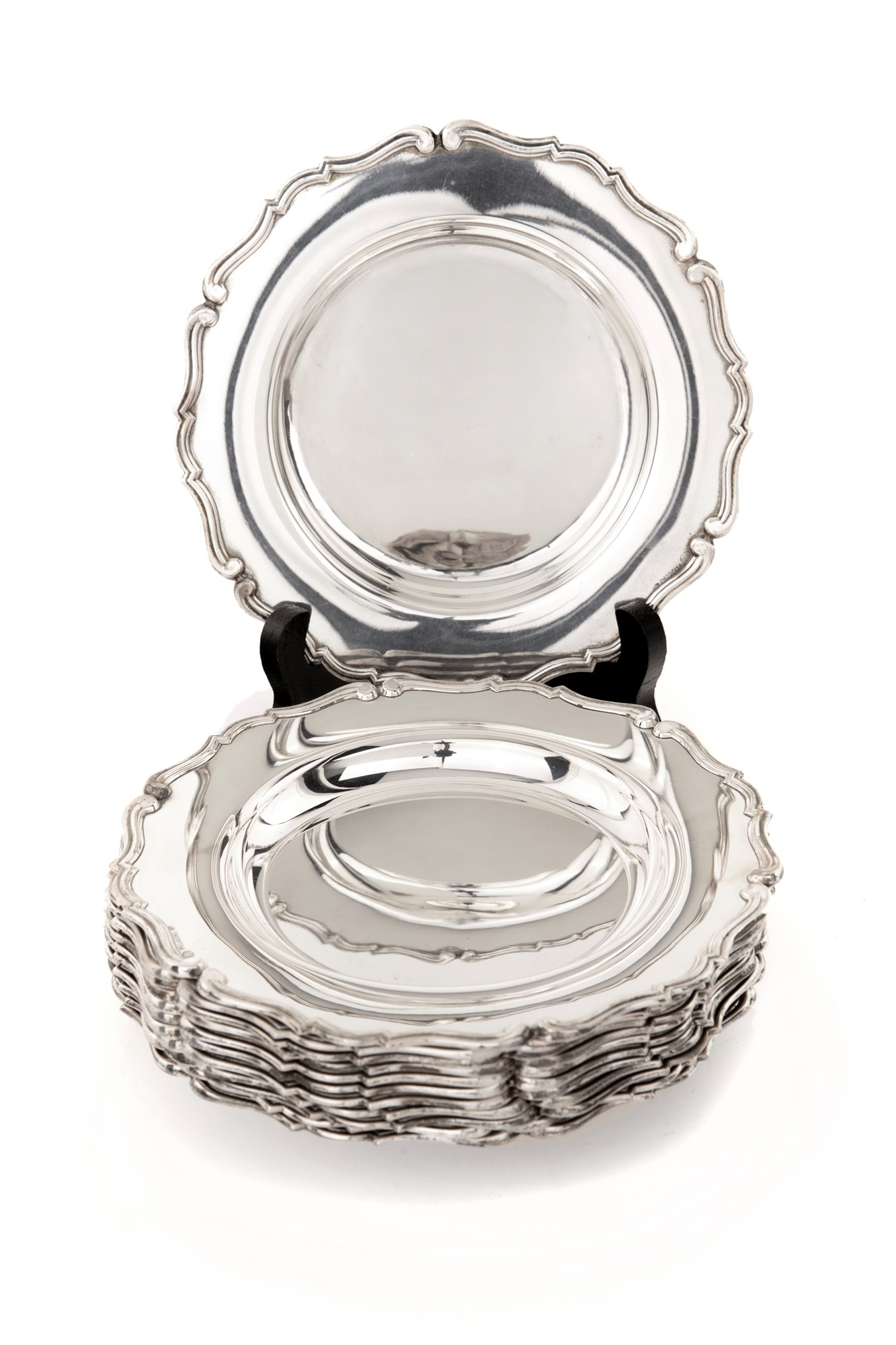 Dodici piattini in argento 800/000, argentiere Frugoni - Roma con orlo sagomato percorso da sottili nervature diametro cm 16,3 - gr. 1136