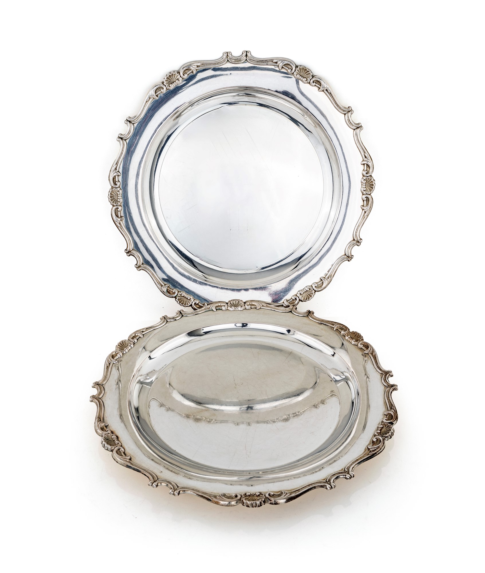 Coppia di piatti da portata in argento 800/000, Frugoni di forma circolare con tesa sagomata racchiusa da volute contrapposte alternate a conchiglie diametro cm 35,5 - peso complessivo gr. 1460