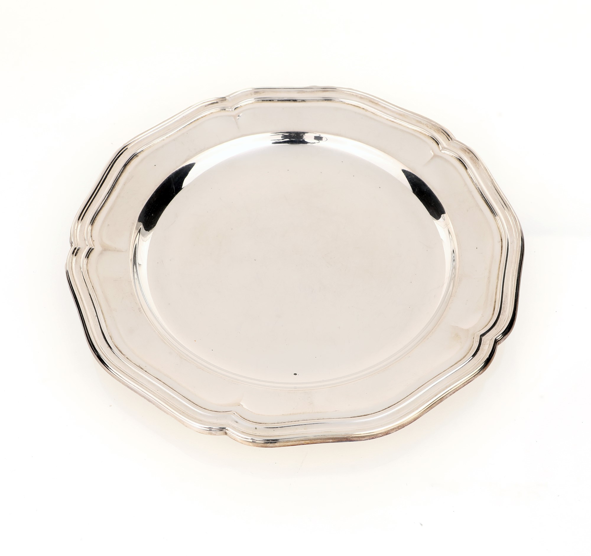 Otto piatti in argento 800/000, Italia, bolli consunti orlo sagomato modanato diametro cm 18 - gr. 1328