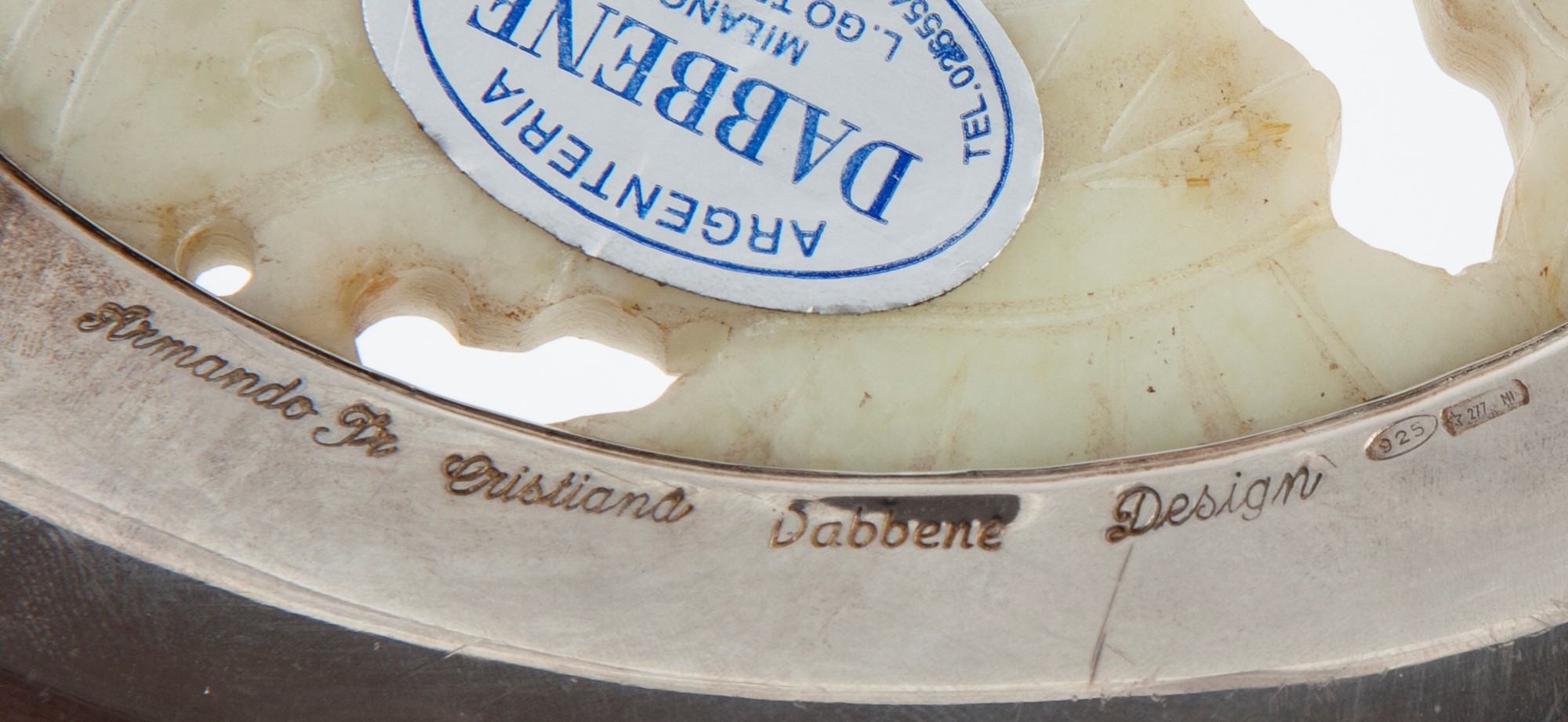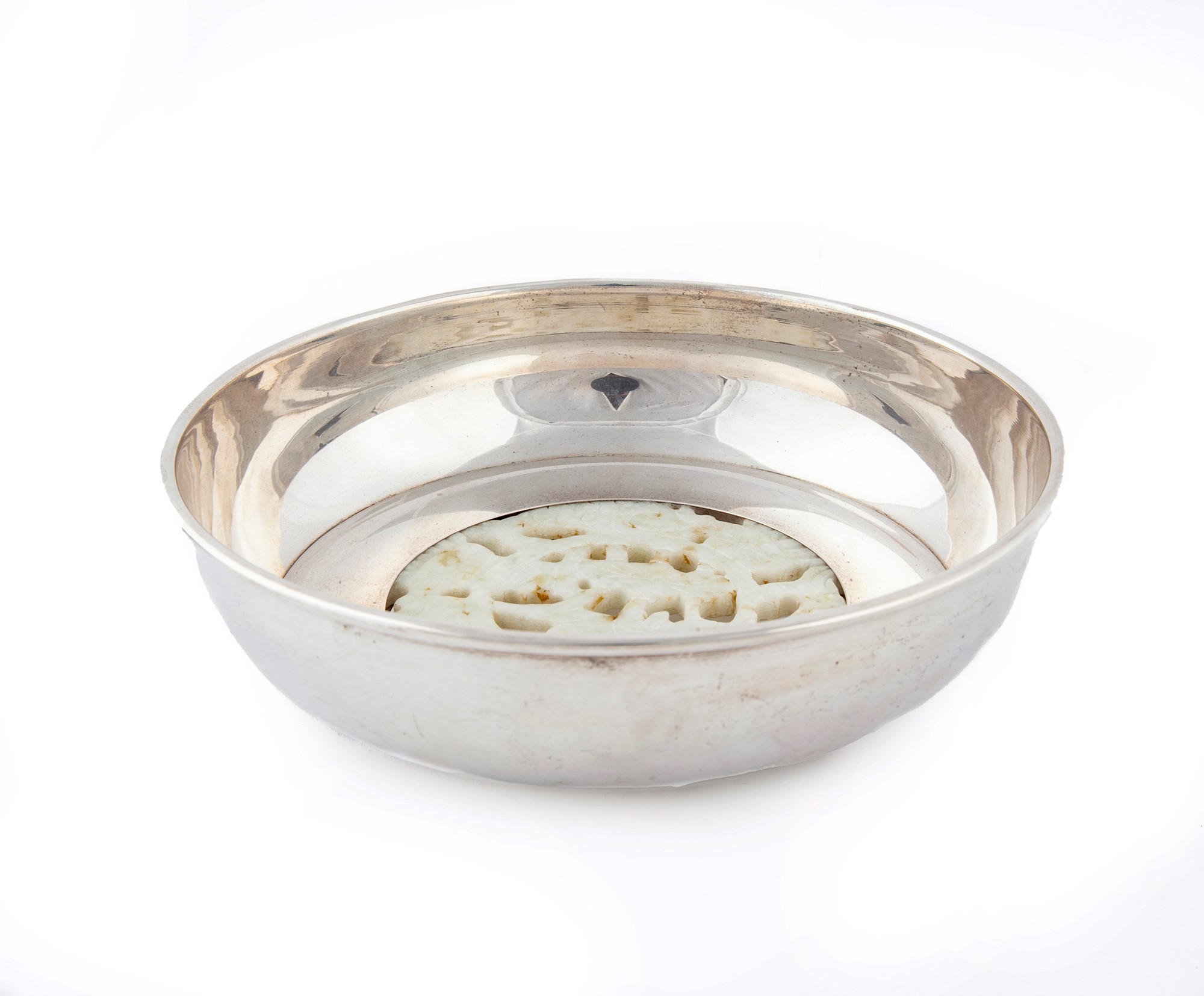 Ciotola in argento sterling e giada traforata, Armando e Cristina Dabbene, Milano, Anni Settanta caratterizzata da un disco in giada traforata ed incisa posto sul fondo a raffigurare una composizione di gusto orientale con pesci e motivi naturalistici; sorretta da tre piccoli piedi a sfera cm 6x19 - peso lordo gr. 365