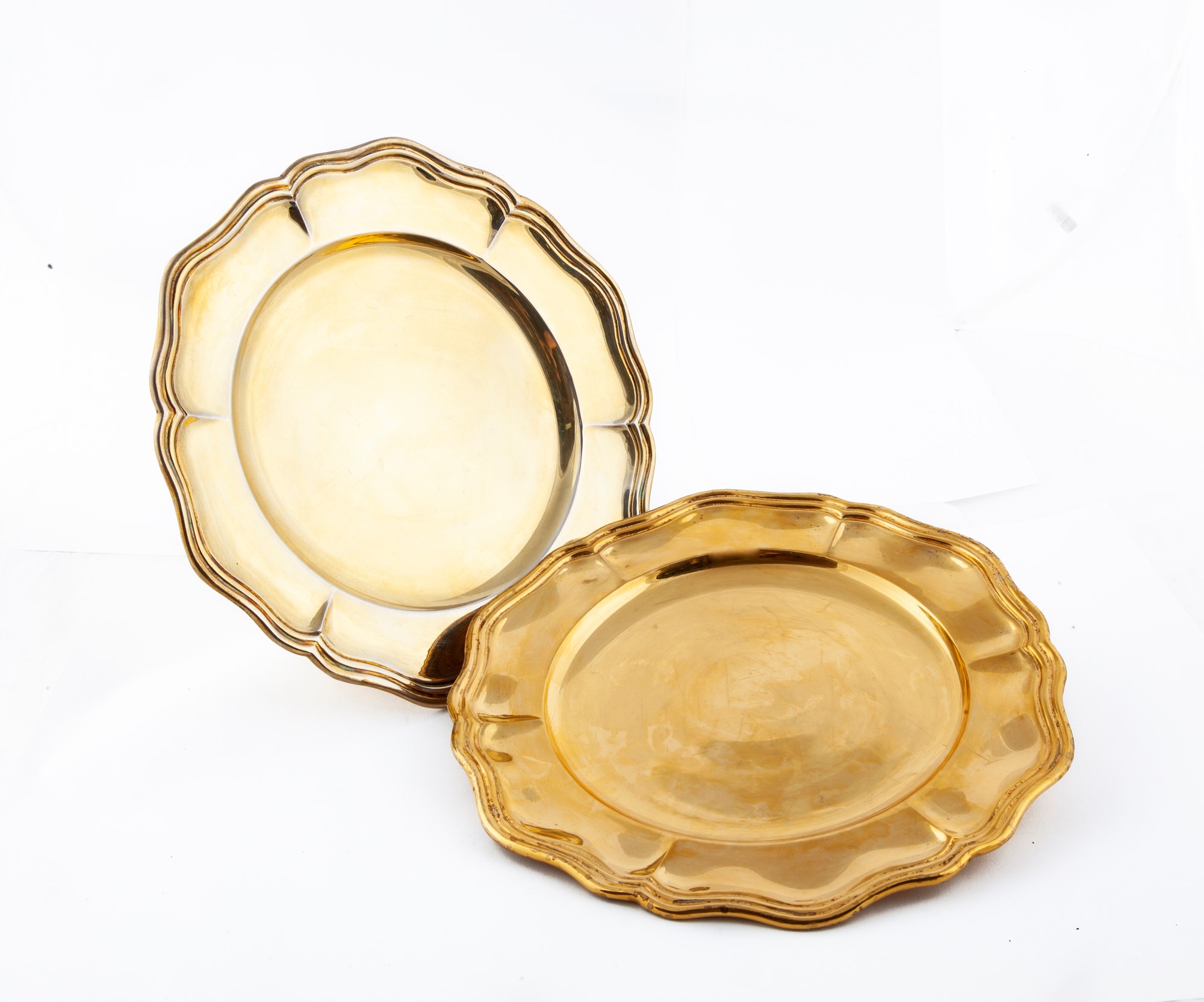 Dodici piatti da dolce in argento dorato, Anni Trenta con orlo sagomato modanato diametro cm 20,5 - peso complessivo gr. 2630
