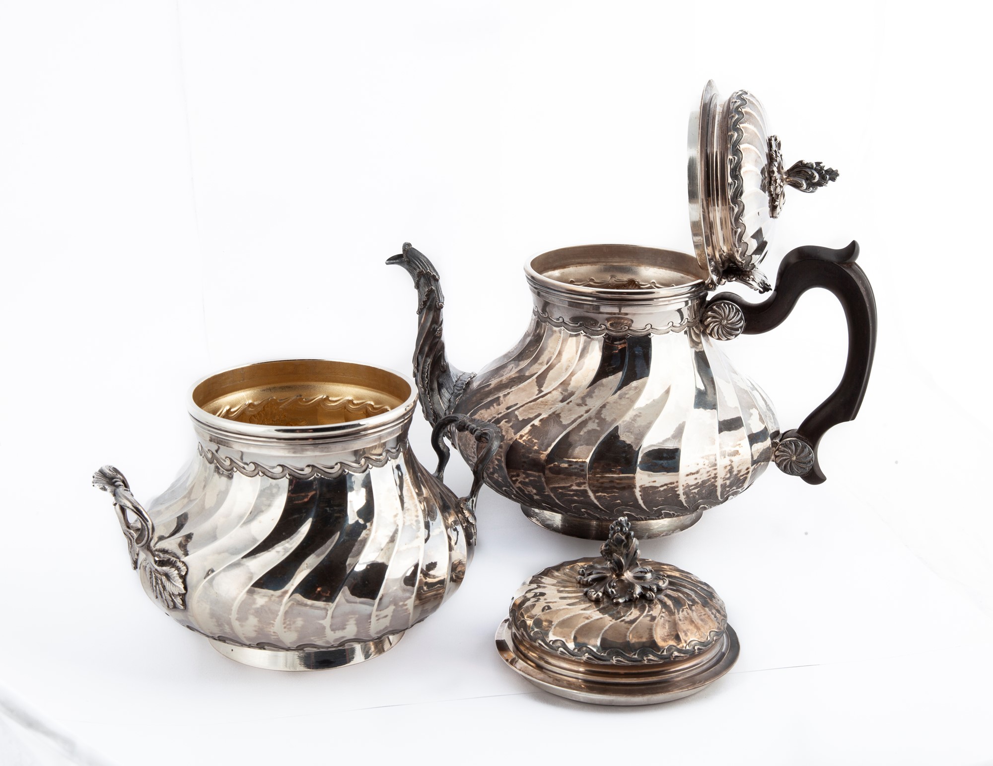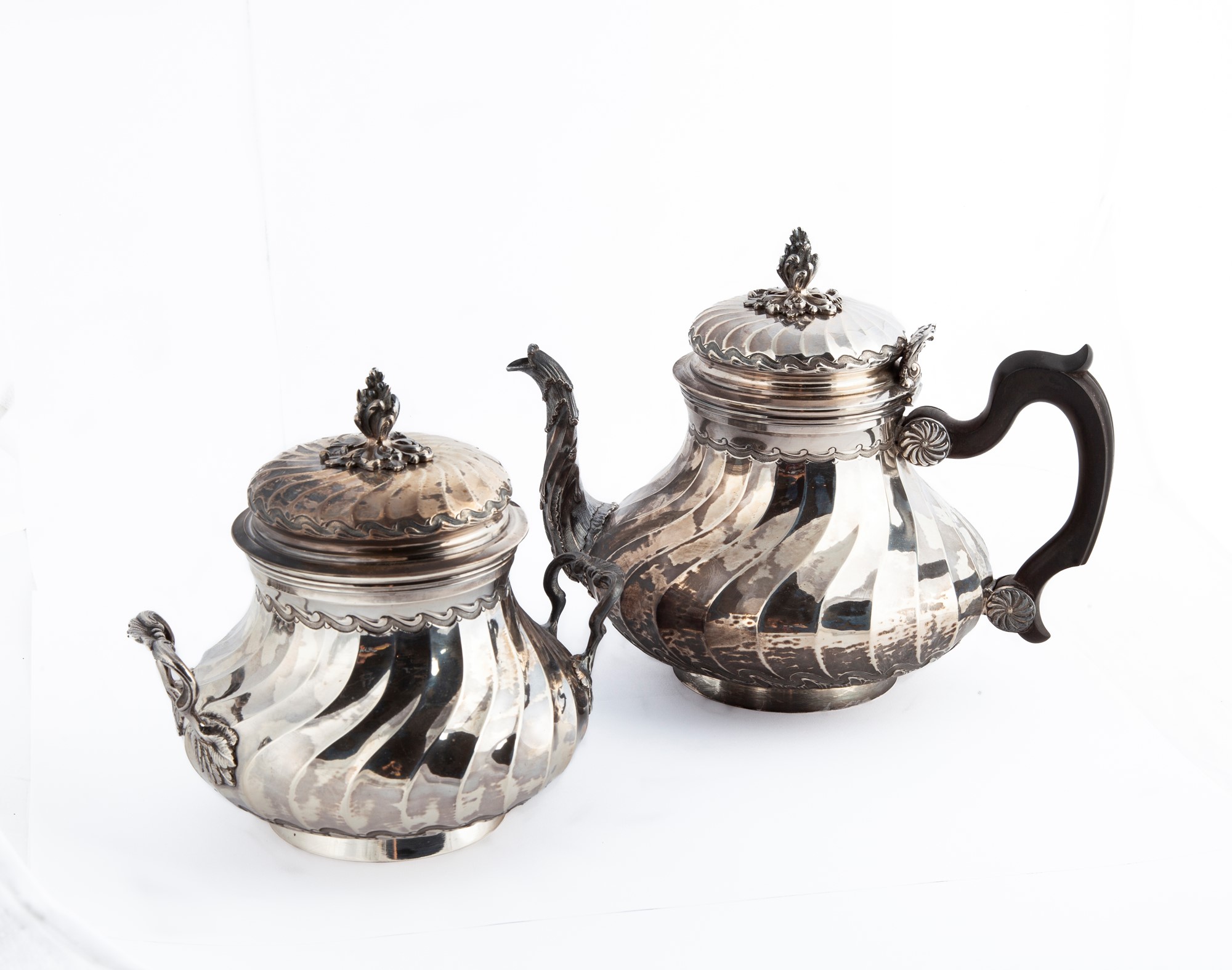 Teiera e zuccheriera in argento, Boin Tabouret, Parigi, dopo il 1873 lavorazione a torchon su piede circolare e coperchi con presa scultorea in forma di cespo; la prima con versatoio sagomato e manico in legno; la zuccheriera con interno dorato e manici sagomati altezza cm 18,5 e cm 16,5 - peso complessivo lordo gr. 1332