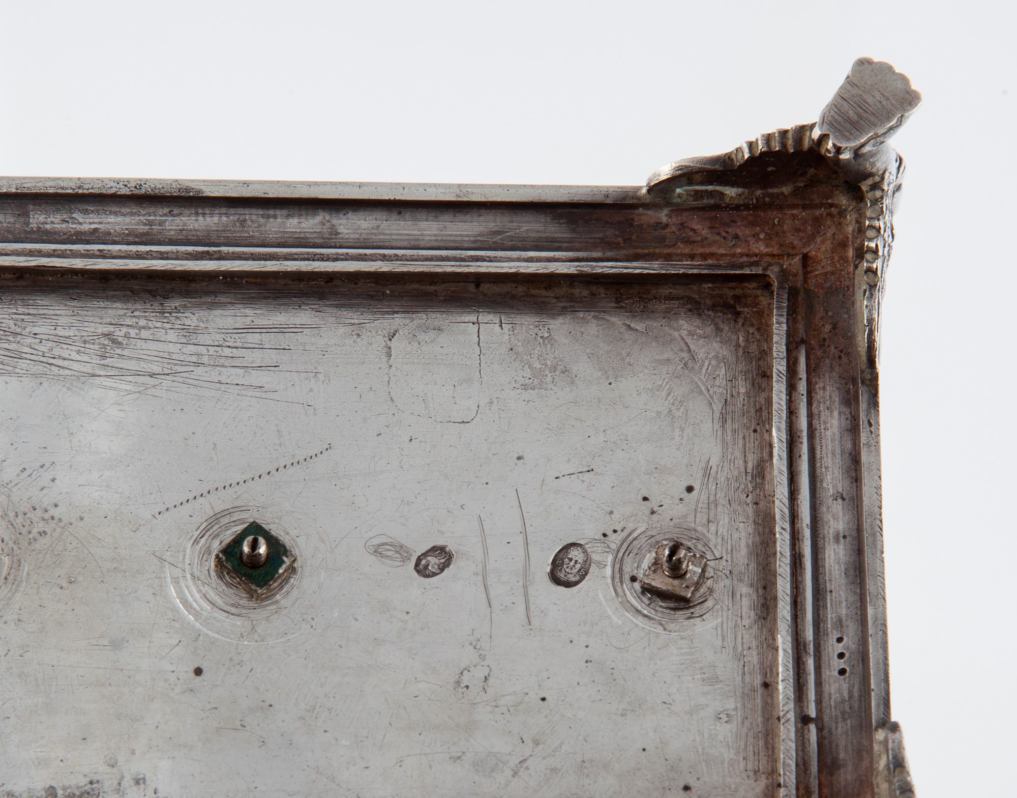Saliera a due vaschette in argento 950, Parigi 1798, argentiere Philippe Jean Baptiste Houges supporto rettangolare con profilo segnato da un lungo serto fogliaceo sorretto da figure angolari di leone alato, presa centrale in forma di vaso classico ai lati del quale sono disposte due alzatine circolari con vaschetta dorata internamente, abbellite da palmette cesellate cm 15,5x18,5x8,5 - gr. 428