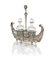 Oliera a navicella in argento 950/1000, 1809 - 1819 con struttura racchiusa da ringhiera traforata a losanghe con vertici terminanti a ricciolo, sorretta da piedi a mensola architettonica; presa centrale sormontata da una sfera a tre ordini di fasce minuziosamente cesellate, due ampolle in vetro con tappo cm 26x27x10 - gr. 465