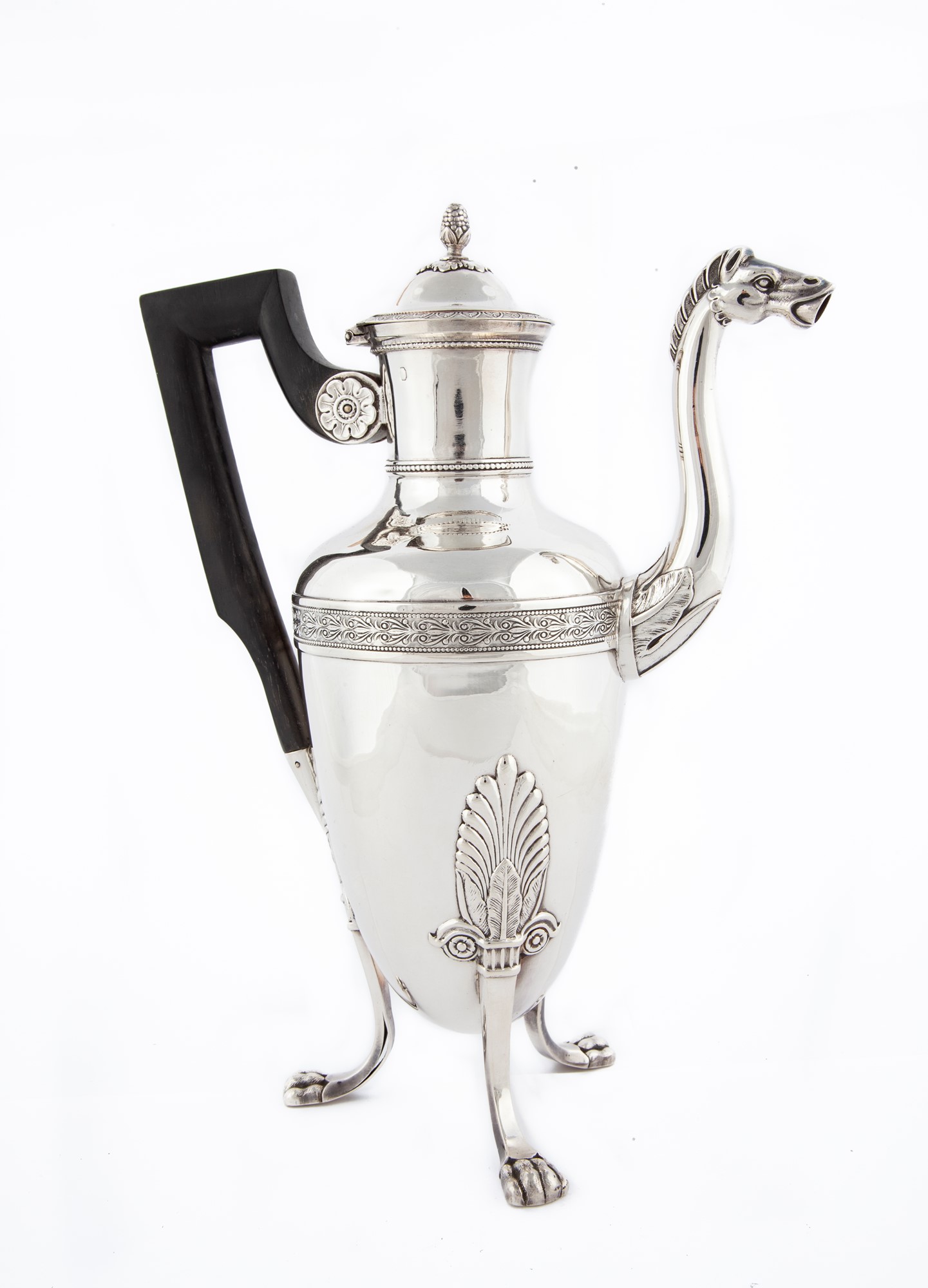 Caffettiera in argento 950/1000, Parigi 1809 - 1819, argentiere Jean Pierre Bibron caratterizzata da versatoio sagomato con beccuccio a testa di cavallo; corpo a uovo sorretto da tre piedi arcuati con attacchi a palmetta ed estremità ferine, coperchio a cupolino incernierato con pomolo in forma di frutto, manico squadrato in legno ebanizzato altezza cm 25 - peso lordo gr. 472