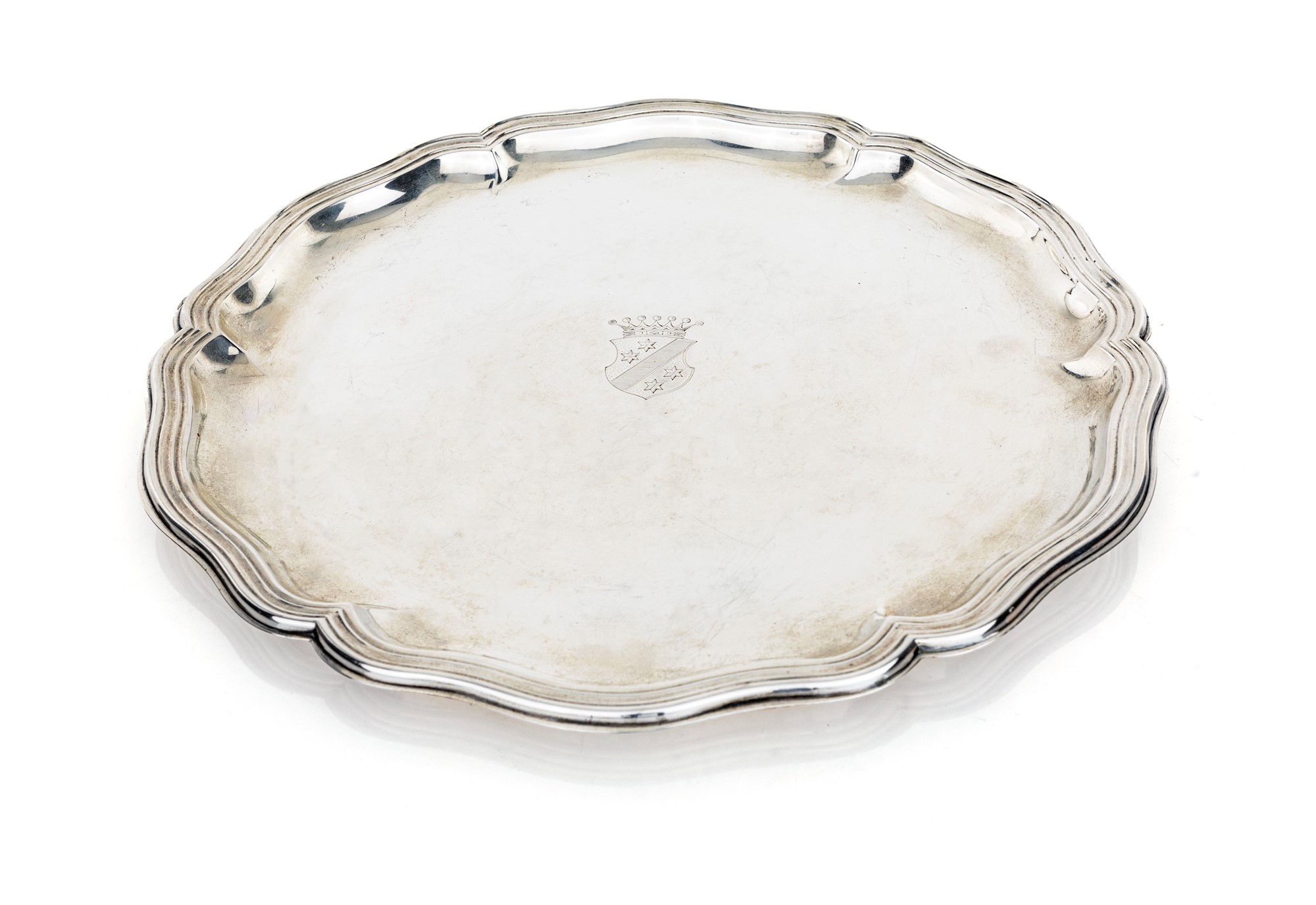 Piatto in argento 830/1000, Germania, post 1888, H.J. Wilm (Berlino) nr. 5920, realizzato dall'argentiere Wilkens M.H. & Sohne (Hemelingen - Brema) di forma circolare con orlo sagomato modanato e stemma baronale inciso al centro. diametro cm 30 - gr. 424