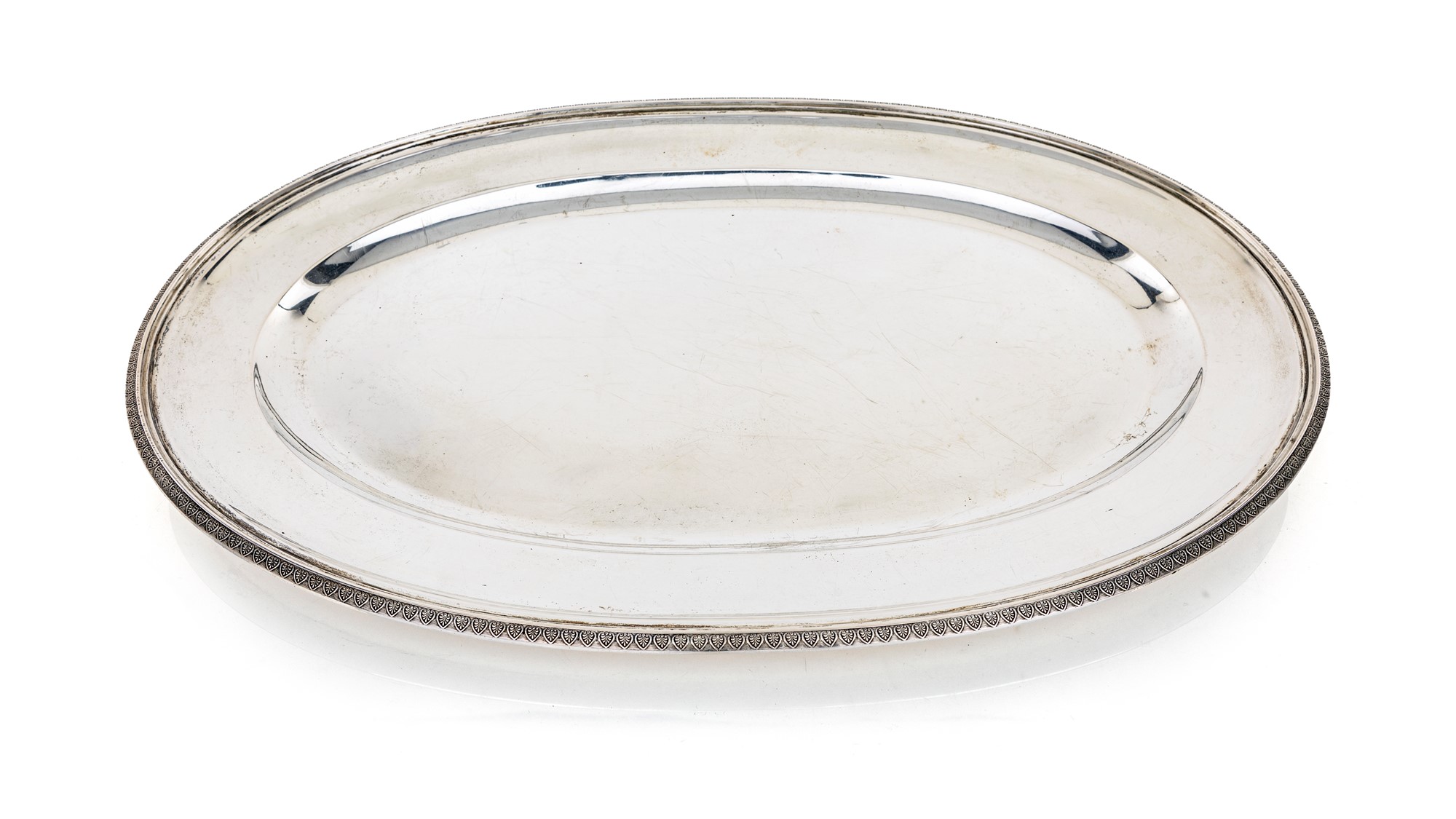 Grande vassoio ovale in argento, Vienna, argentiere Joseph Carl Klinkosch (attivo dal 1843 al 1888) con profilo percorso da palmette incise su fondo rigato cm 50x33 - gr. 1564
