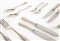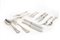 Servizio di posate in argento 800/1000 composto da dodici cucchiai da minestra (gr. 838), dodici forchette (gr. 842) ed altrettanti coltelli da pasto, sei forchette da frutta (gr. 248) e sei coltelli, due cucchiai e due forchette da portata (gr. 460) ed un ramaiolo (gr. 234); ogni posata è caratterizzata da impugnatura con vertice arrotondato dominato da palmetta peso complessivo gr. 2.622 (esclusi i coltelli)