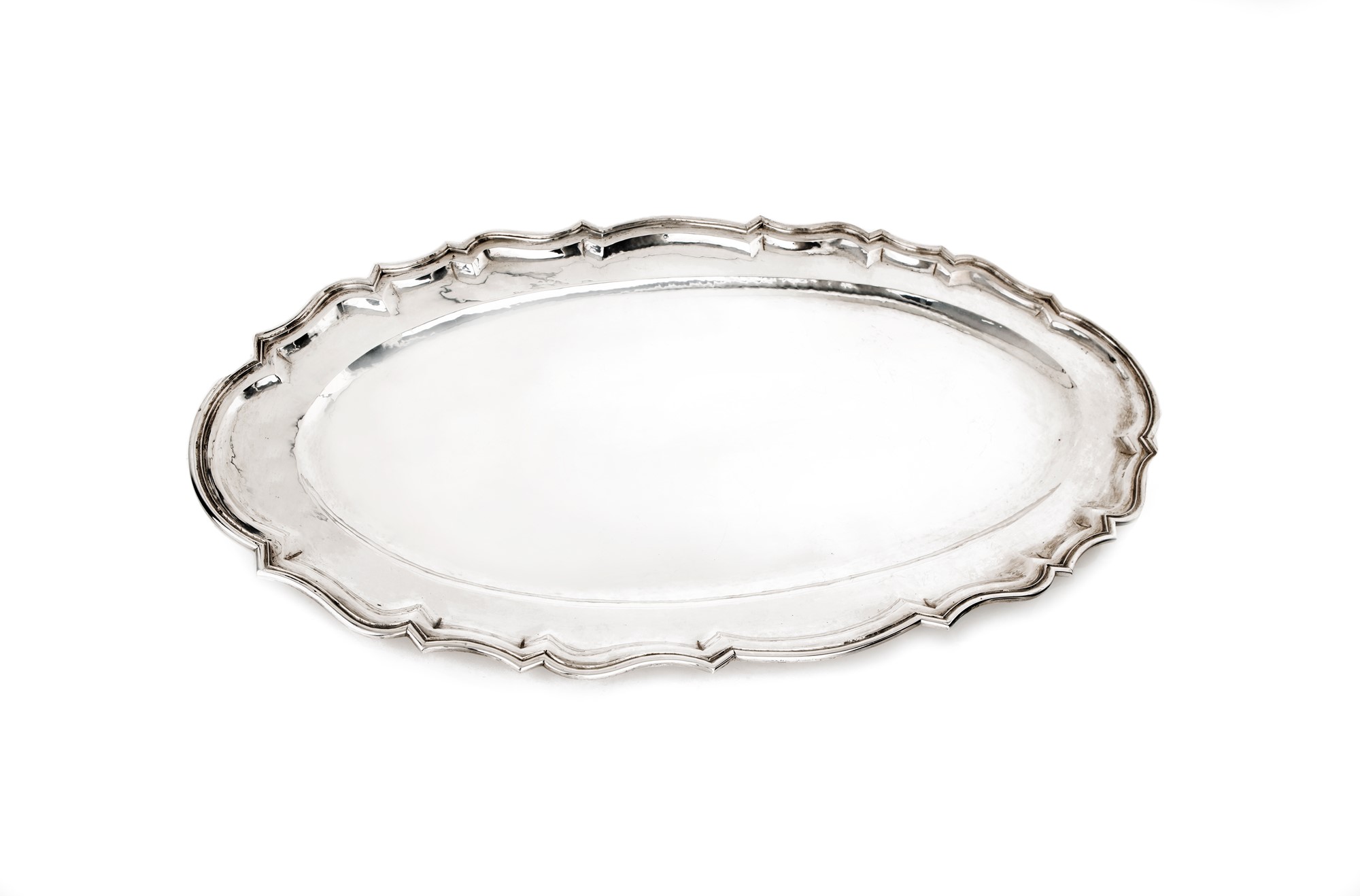 Pescera in argento, Venezia, XX secolo, argentiere MR dalla caratteristica forma ovale allungata con tesa curvilinea con profilo modanato. Bollo leone in moeca cm 72x38 - gr. 2326
