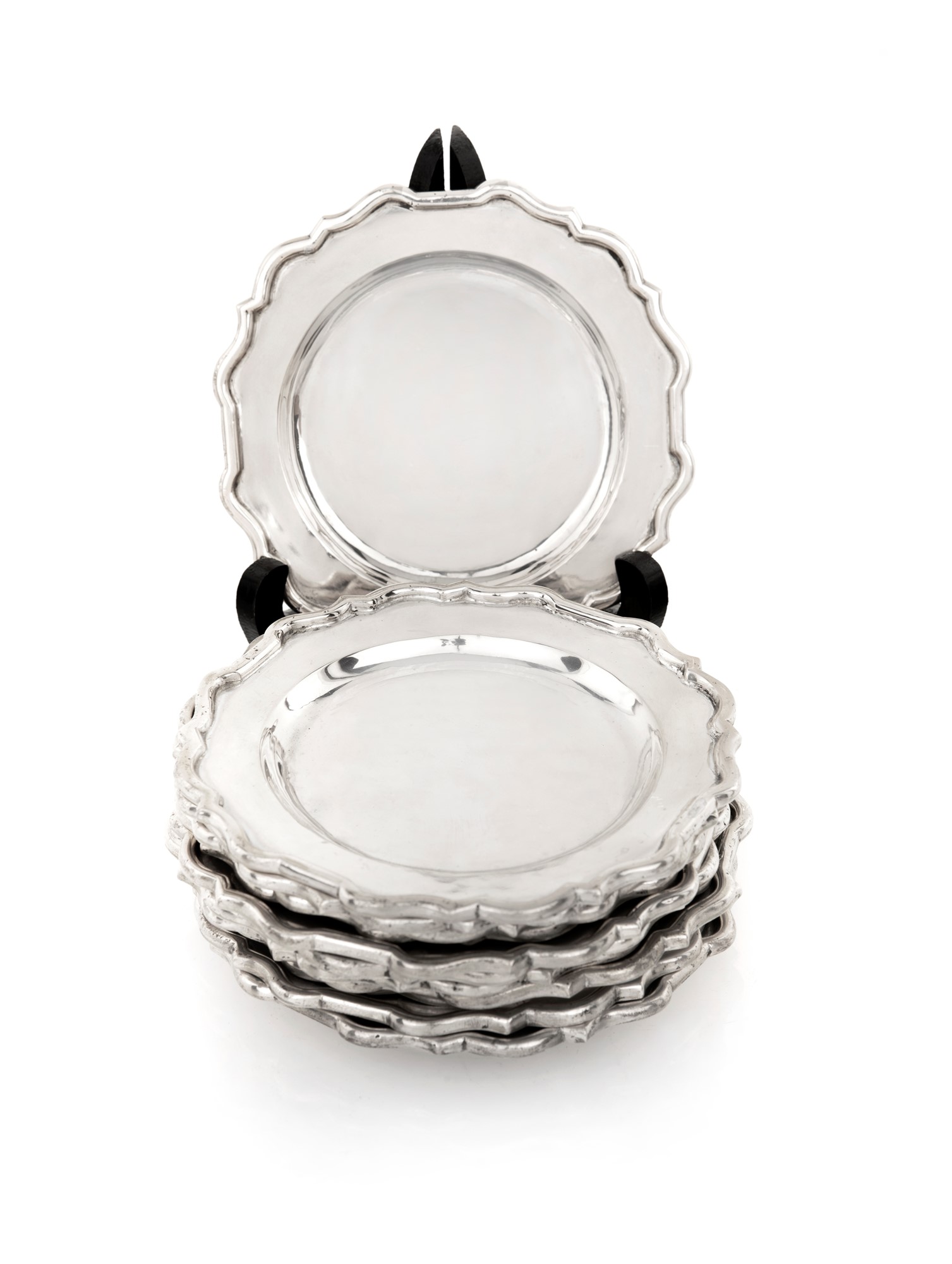 Dodici piattini da pane in argento, Venezia, XX secolo, argentiere MR tesa con orlo mistilineo sottolineato da cordolo liscio. Punzone leone in moeca diametro cm 13,5 - gr. 1714