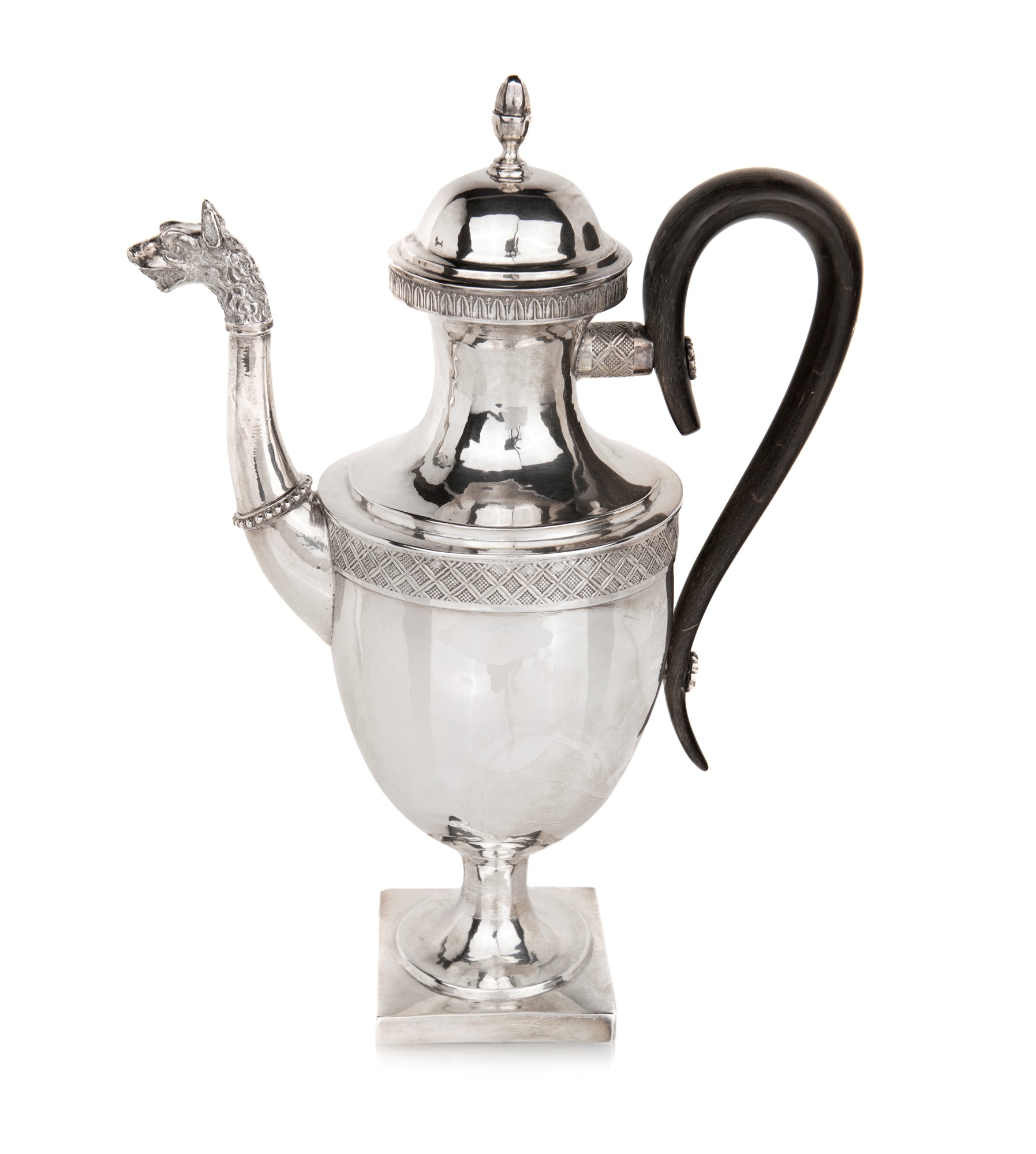 Caffettiera in argento, Roma, Stato Pontificio, dopo il 1815, argentiere Stefano II Sciolet (attivo dal 1826 al 1869) corpo ad anfora decorato da una fascia incisa a losanghe e versatoio sagomato con beccuccio a testa di lupo; coperchio a cupolino incernierato sormontato da una ghianda, manico sagomato in legno, piede circolare su base quadrata. altezza cm 25 - gr. 440