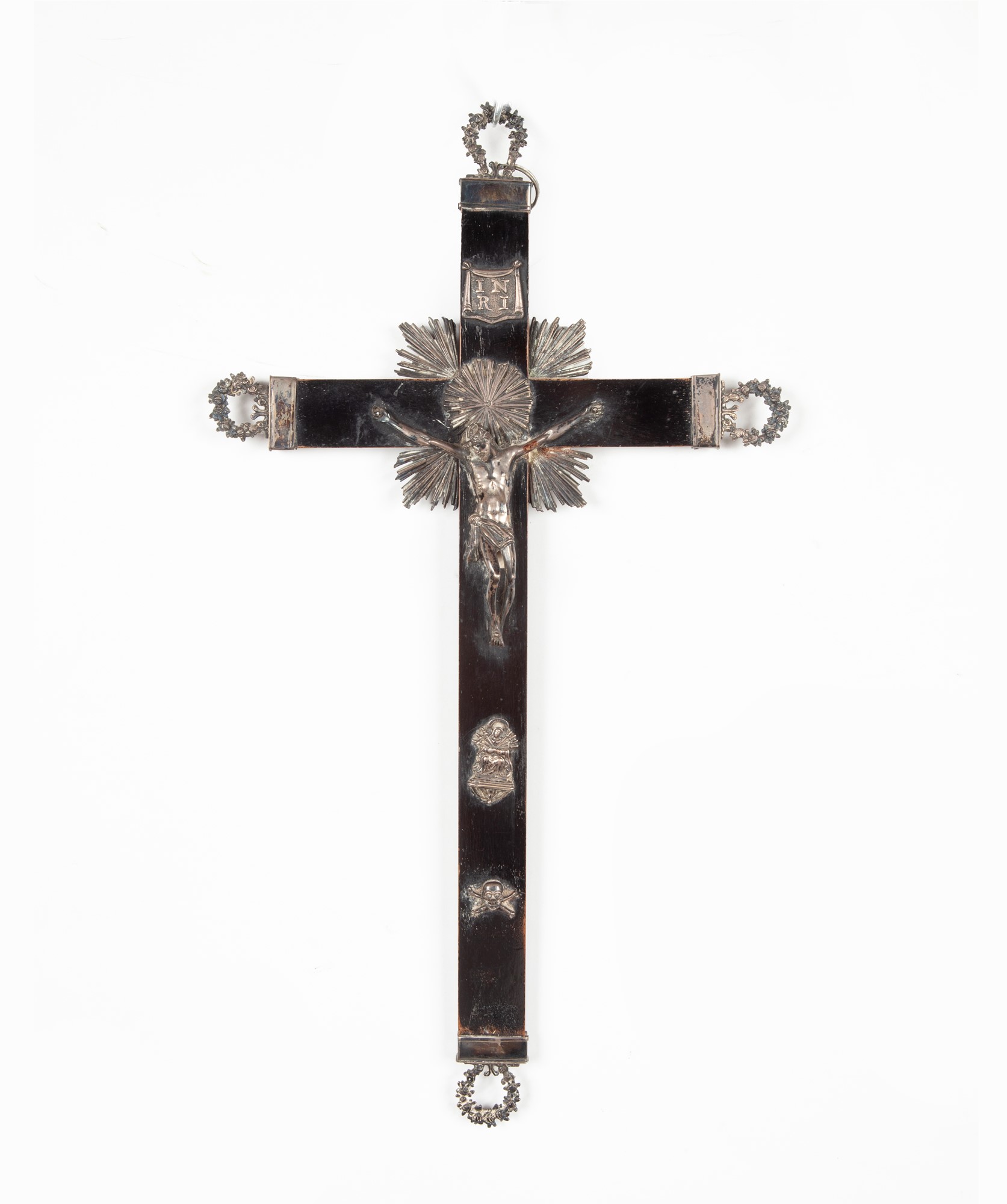 Cristo crocifisso in argento in fusione a cera persa e cesellato, Roma, dopo il 1815, argentiere Raffaele Bertozzini (attivo dal 1801 al 1833) su croce in legno ebanizzato, coi simboli della passione anch'essi in argento cesellato; completo di puntali con corone di fiori e raggiere in argento. Bolli camerali pontifici e bollo dell'argentiere R32B (Raffaele Bertozzini) la figura cm 10 - l'insieme cm 44,5x25