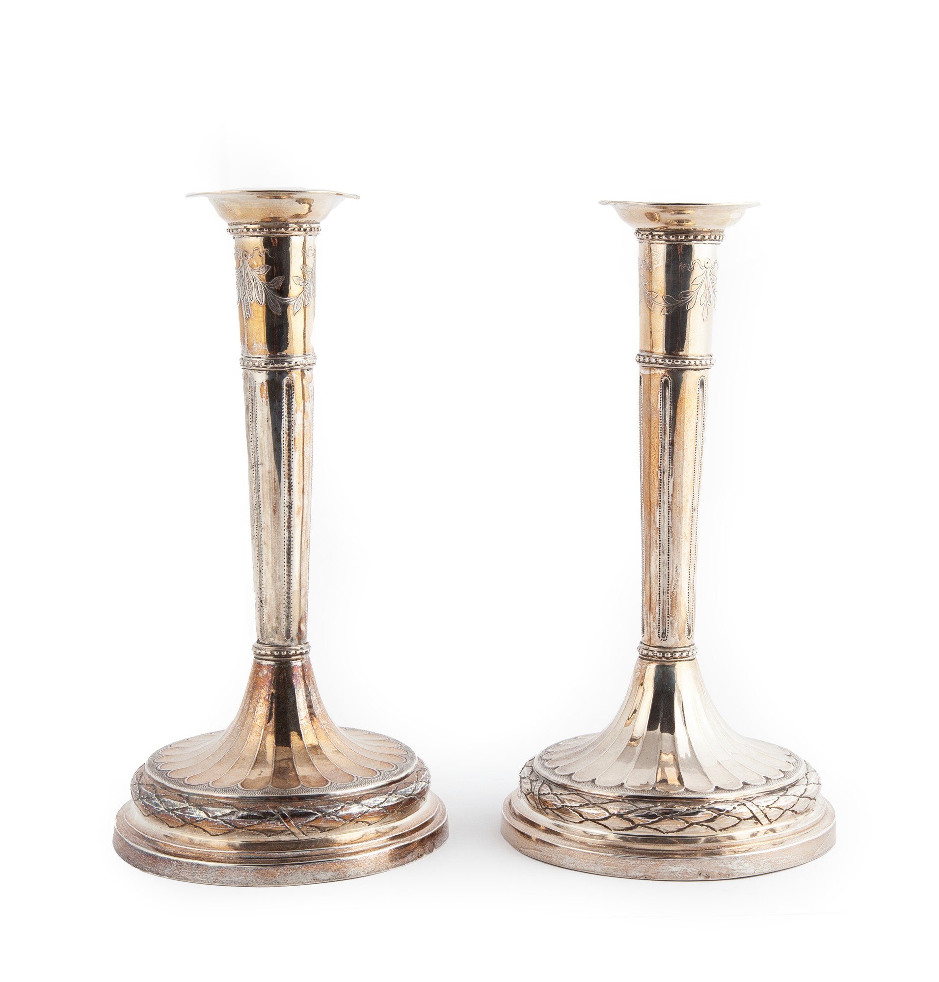 Coppia di candelieri in argento, Roma, fine del XVIII/inizi del XIX secolo con fusto liscio percorso da lunghe scanalature puntinate e reggicandela decorato da una ghirlanda incisa; piede circolare gradinato con profilo sottolineato da un festone d'alloro idealmente trattenuto da nastri incrociati altezza cm 22,7 - gr. 546