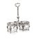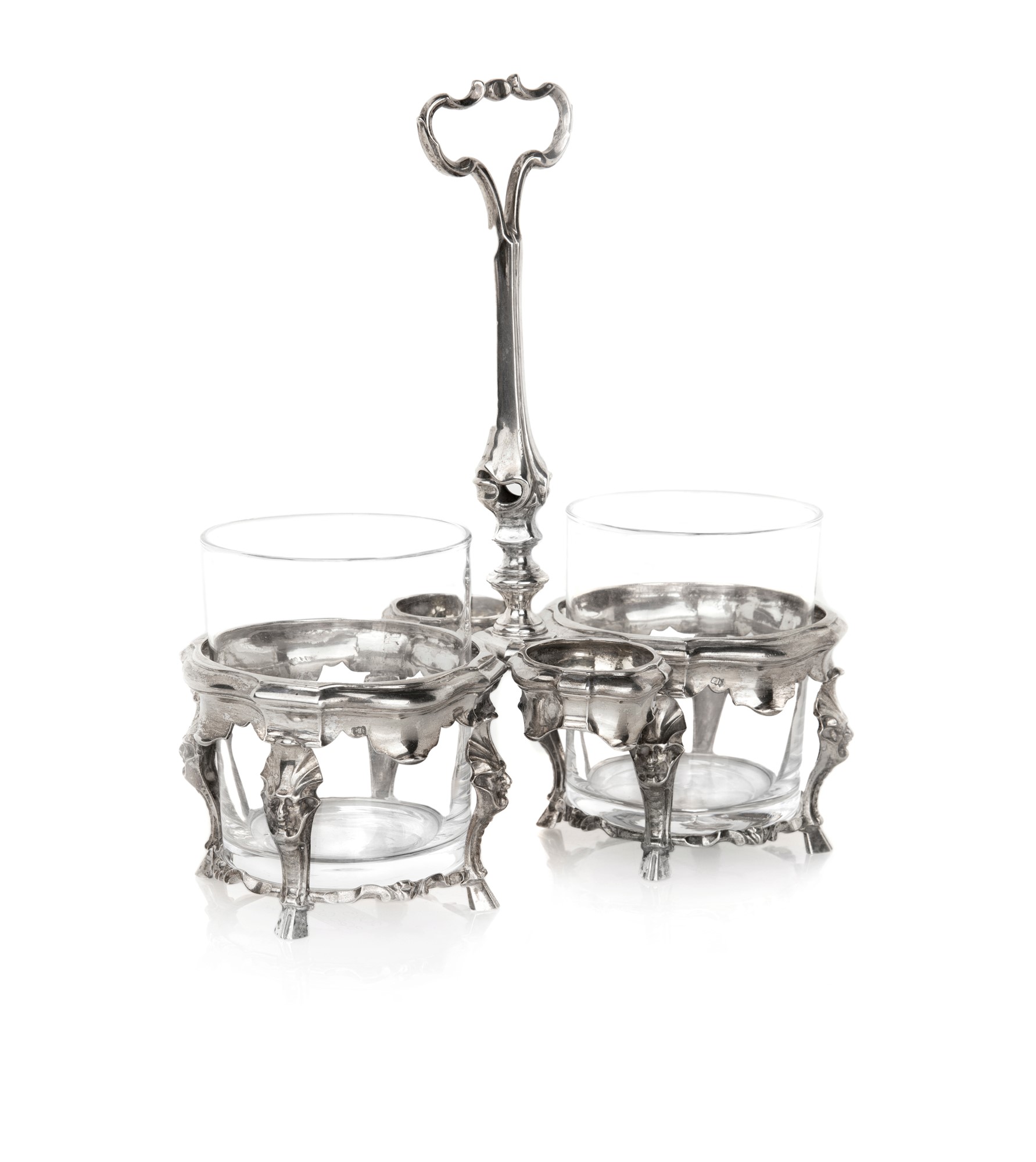 Acetoliera in argento, Italia, seconda metà del XVIII secolo con due piccole saliere sospese e porta ampolle sostenuti da lesene con mascheroni grotteschi e piedi a zoccolo; presa centrale e balaustro con terminale ad anello. Ampolle mancanti sostituite da contenitori cilindrici in vetro incolore cm 24x21x13 - gr. 620