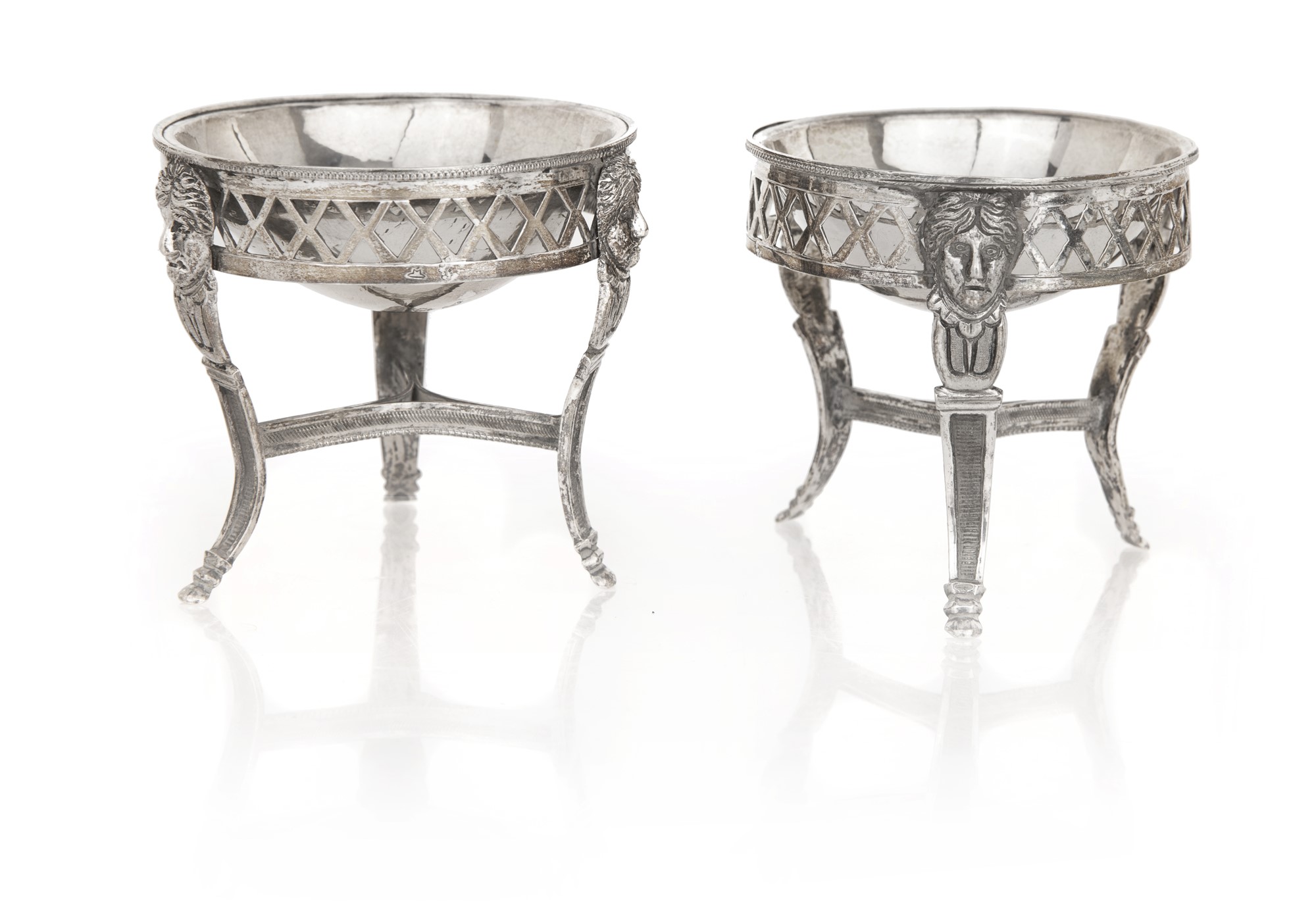 Coppia di saliere in argento 800/000, lombardo - veneto, prima metà del XIX secolo con vaschetta circolare trattenuta da ringhiera a losanghe, sorretta da tre figure di cariatide riunite da traverse cm 6,5x7 - gr. 170
