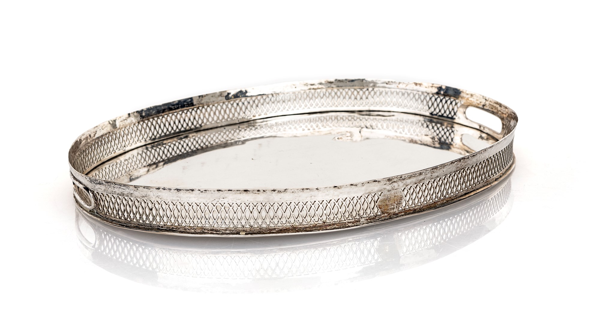 Vassoio ovale in argento, lombardo-veneto, prima metà del XIX secolo con ringhierina traforata ed aperture per la presa poste ai vertici; al centro di un lato, piccolo medaglione circolare cm 3,5x38x28 - gr. 812