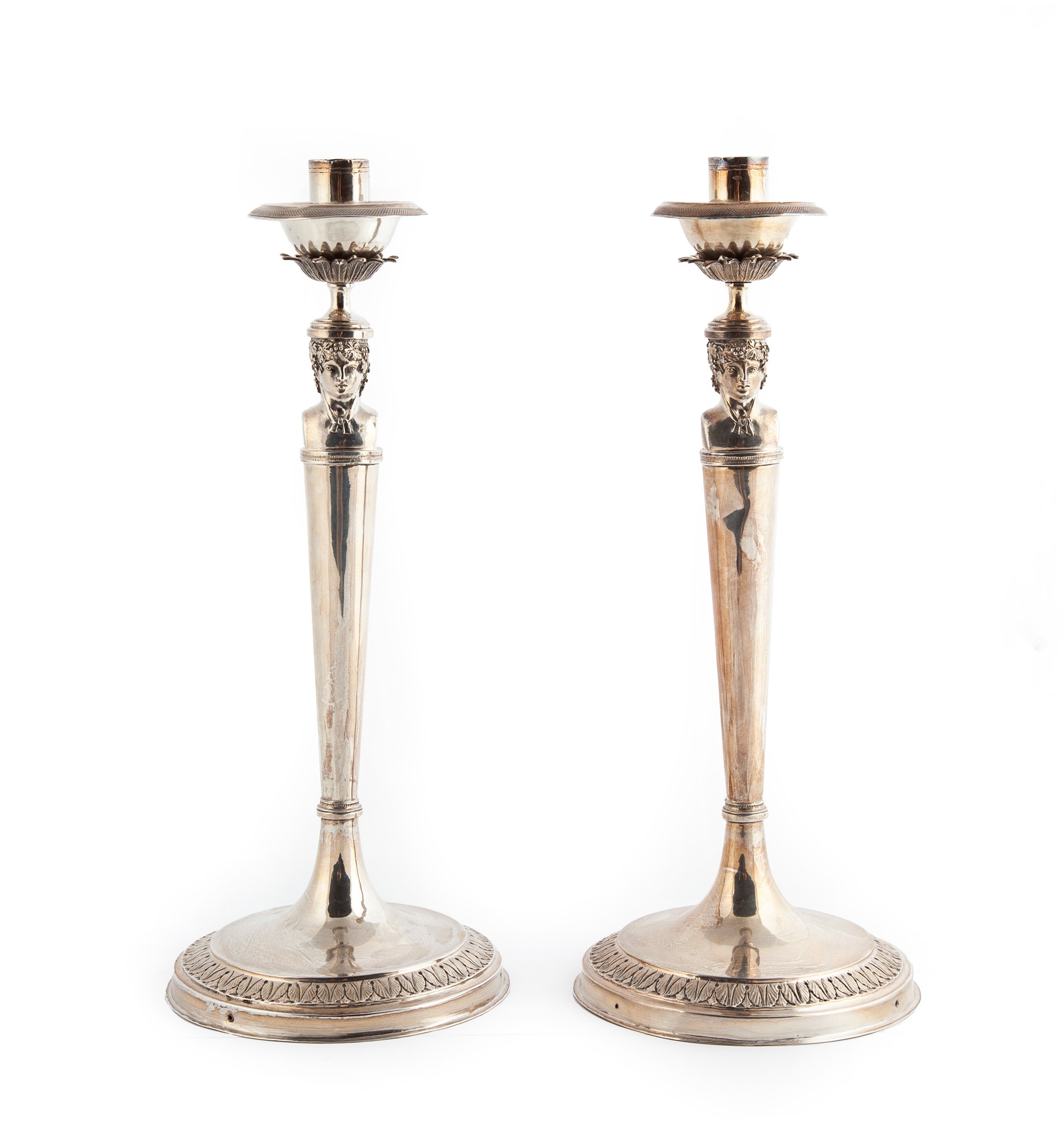 Coppia di candelieri in argento, Roma, Stato Pontificio, dopo il 1815, argentiere Filippo Della Miglia (attivo dal 1828 al 1856) caratterizzati da erma di Bacco bifronte su cui posa un calice impreziosito da lunghe foglie lanceolate minuziosamente cesellate; al centro reggicandela cilindrico; piede circolare con profilo a palmette. Lievi difetti altezza cm 30,5 - gr. 516