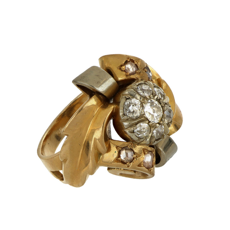 Anello anni 40 in oro giallo di considerevole peso impreziosito al centro da diamanti di taglio antico.