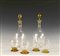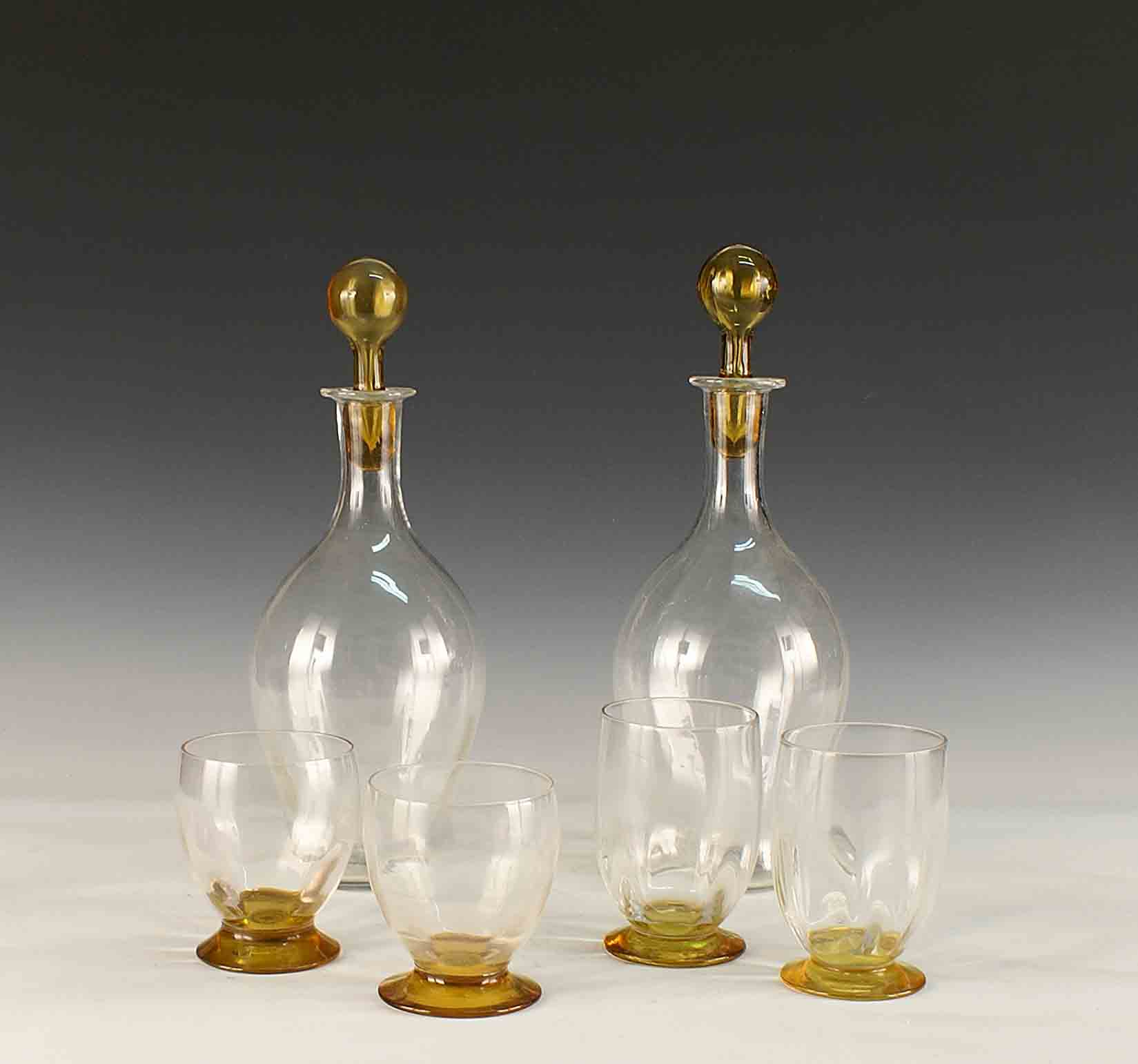 Servizio di bicchieri in vetro trasparente e colorato composto da sei bicchieri acqua, sei bicchieri vino e due bottiglie con relativi tappi .