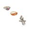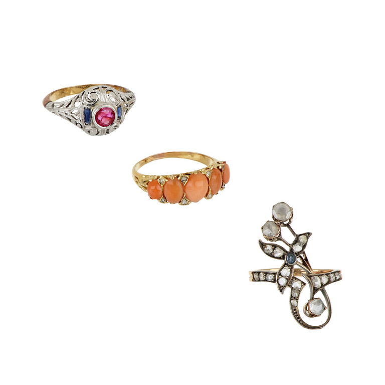 Lotto composto di tre anelli di antica manifattura in oro e argento diamanti taglio antico e rosa coralli rubino e piccoli zaffiri.