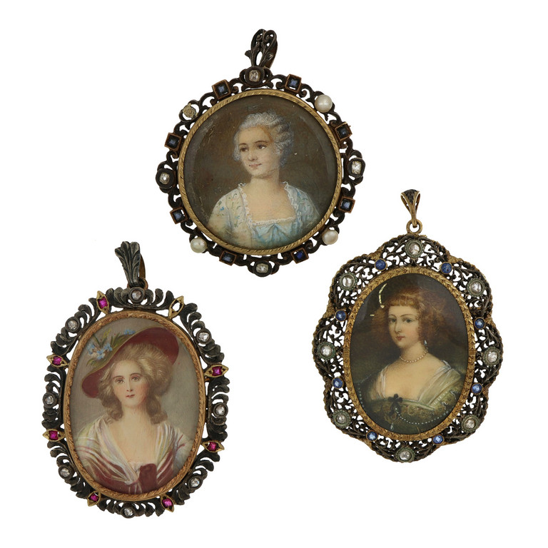 Tre eleganti miniature in argento e oro raffiguranti tre dame dell'800 impreziosite da incisioni sui fondelli e sui bordi da diamanti di taglio antico zaffiri rubini e perline.