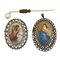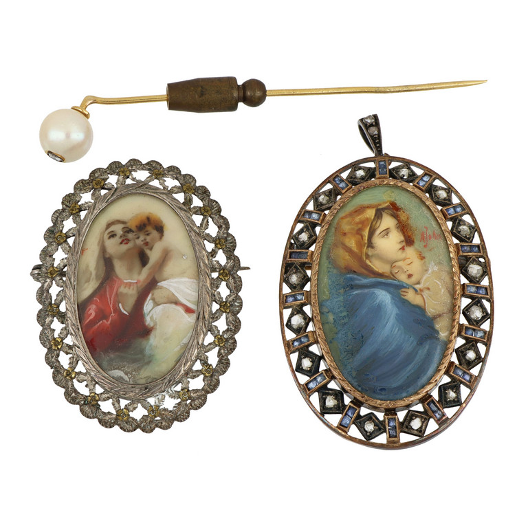 Lotto composto da tre spille in oro e argento una con perla e piccolo diamante al centro le altre con miniature a sfondo religioso.