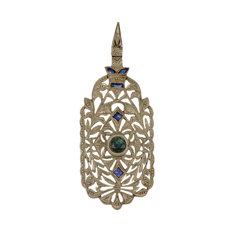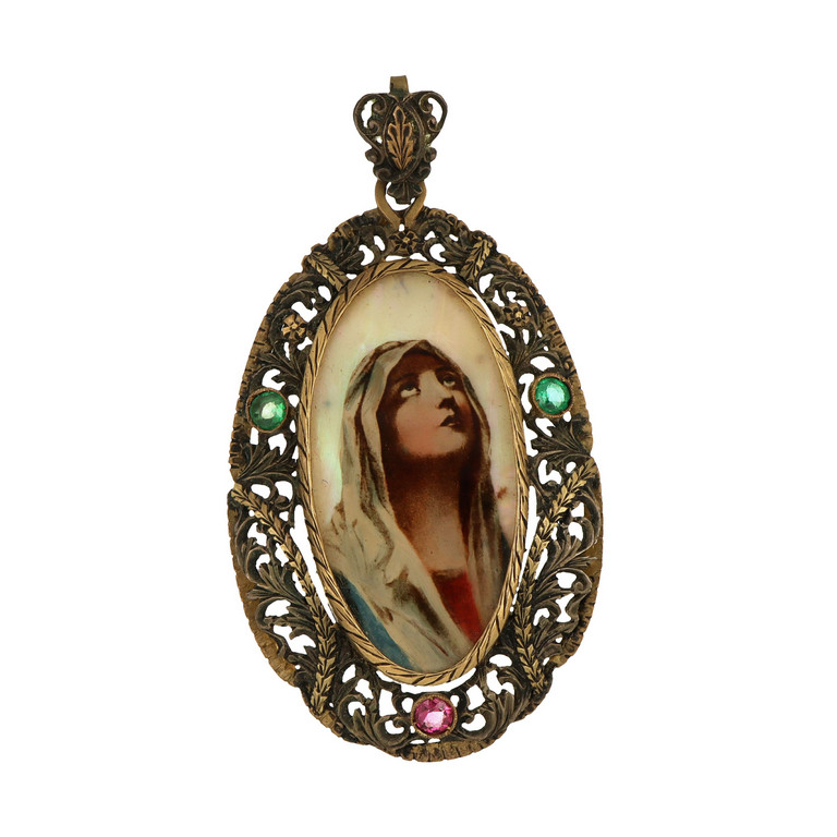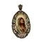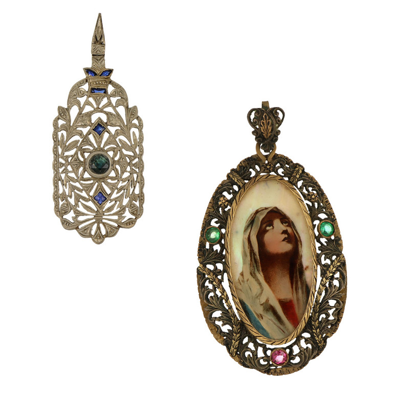 Due ciondoli in oro uno e argento e oro l'altro piccole pietre di colore e miniatura religiosa al centro.